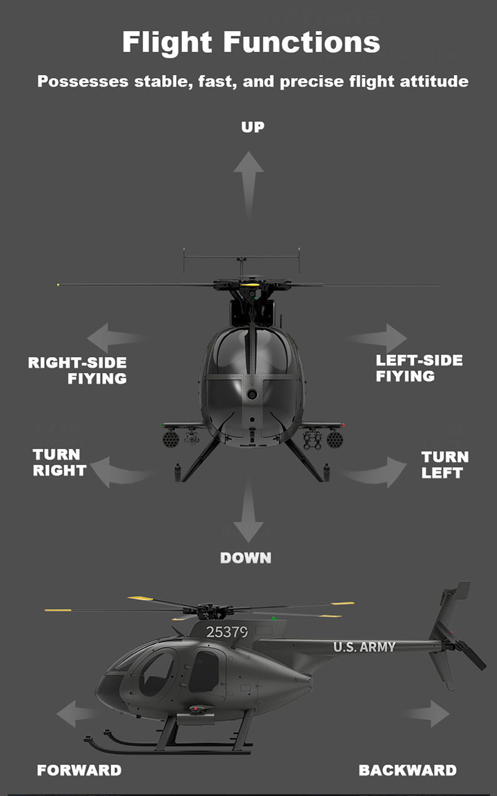 1. Basierend auf dem amerikanischen MD500 Little Bird Hubschrauber, mit maßstabsgetreuer Verkleinerung im Maßstab 1:16, hoher Detailtreue und cooler Beleuchtung.