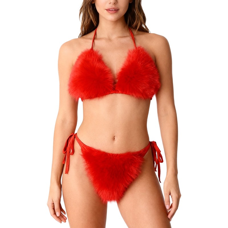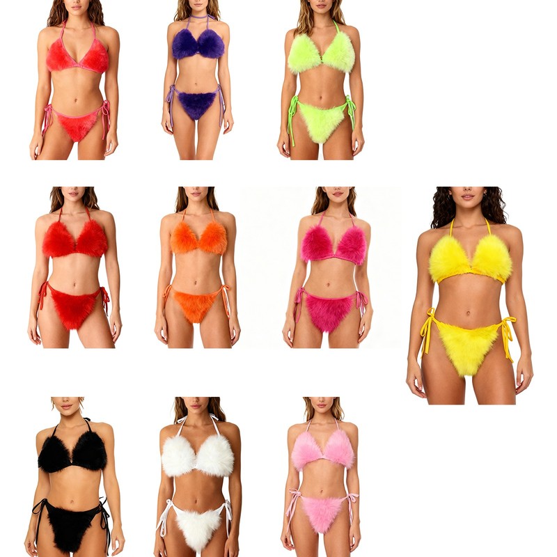 Women Fuzzy Plush Lingerie Set Detachable Faux Fur Halter Bra Top Briefs Bikini