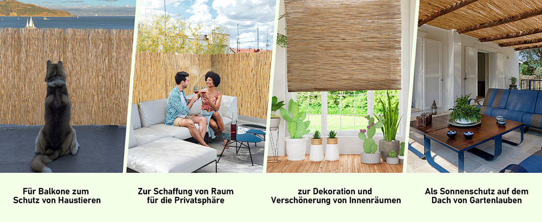 Die Schilfrohrmatte eignet sich sowohl für Innen- als auch Außenbereiche. Sie kann als Sichtschutz auf Balkonen, in Höfen und Gärten verwendet werden oder als Dekoration, um dem Raum eine natürliche Kunstatmosphäre zu verleihen.