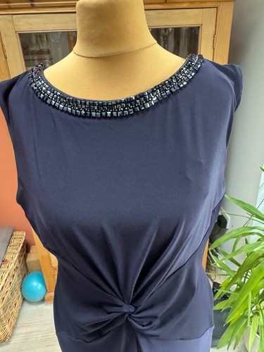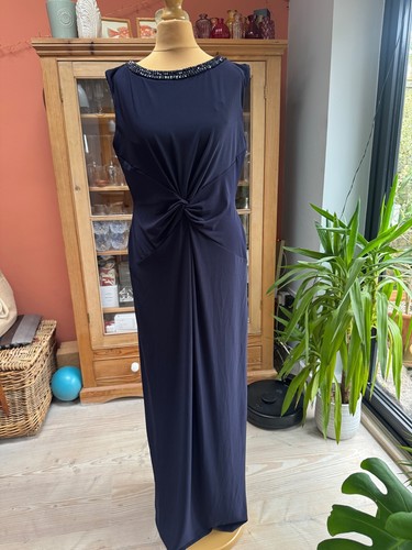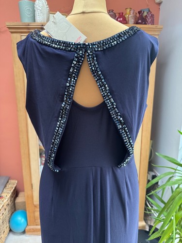 An absolutely beautiful fluid silky jersey evening dress from MONSOON, in navy blue with stunning sparkly gemstone detail all around the neckline, and with a twisted gathering detail on the front, and with a key-hole opening on the back. Please note - my mannequin is too small for this dress so it doesn't look quite right!!