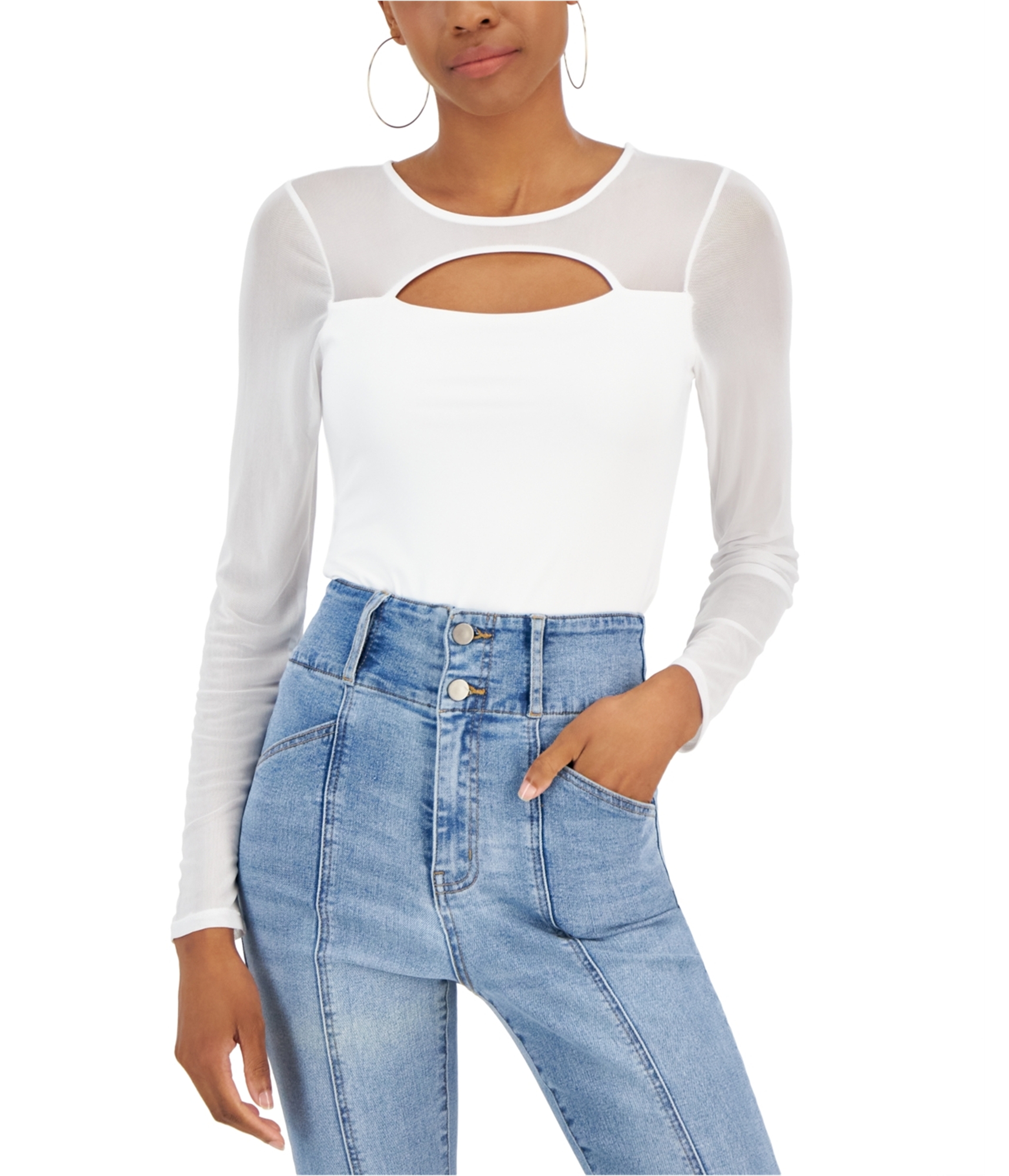 CUTOUT CHIC: Unearthing a daring cutout that anchors your look with modern edge. The semi-opaque mesh paneling contours this sensational bodysuit, providing a sleek second-skin feel for a confident stride as you navigate urban adventures.