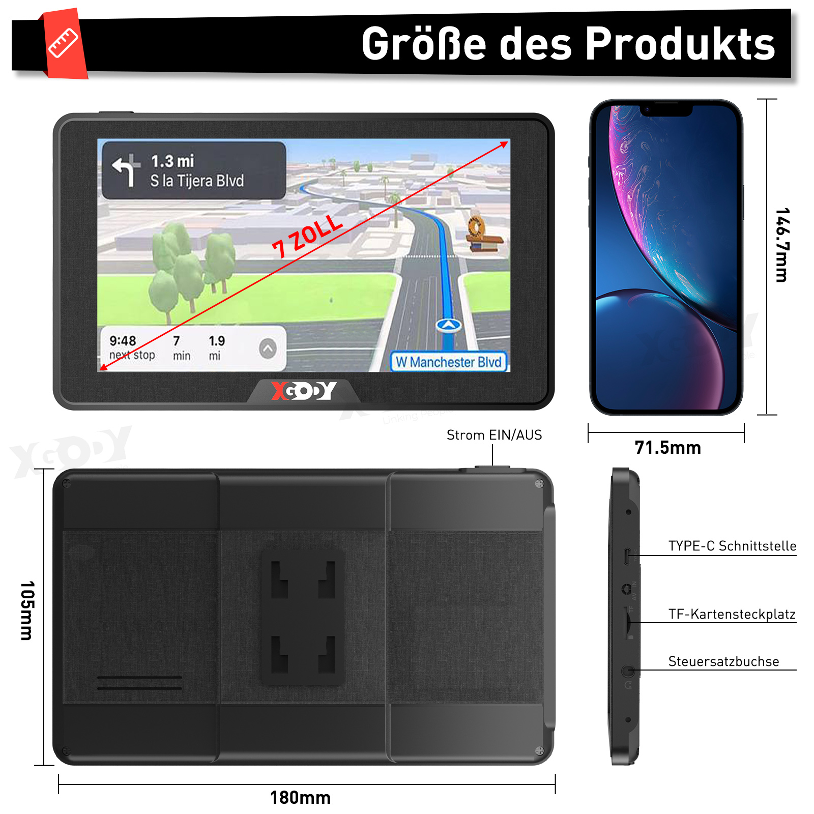 | 【Navigationsgeräte für auto 2024】Europe kostenlos offline-kartenmaterial, eingebaute GPS antenne, um ohne internetverbindung navigieren. Es unterstützt eine Vielzahl europäischer Sprachen mit klarer Sprachausgabe. Bequem für sie, um in ganz europa zu navigieren. 2D 3D skartenansicht, lebenslange kartenaktualisierung kostenlos, fahrspurassistent, geschwindigkeitsanzeige, PLZ ziel eingabe, POIs, Blitzerwarner für auto, Sprachführung.Für Navigationsupdates kontaktieren Sie uns bitte. 【7 Navigationsmodi】 XGODY Navigation unterstützt sieben Navigationsmodi - LKW, Auto, Bus, Fußgänger, Taxi, Fahrrad. Es kann Ihre unterschiedlichen Navigationsanforderungen erfüllen, die Navigation kann die Route entsprechend der Größe (Länge, Höhe, Breite), dem Gewicht, der Anzahl der Achsen und der Höchstgeschwindigkeit des Lkw planen, und Sie können Straßen mit Höhen, Breiten und Gewichtsbeschränkungen vermeiden. So kommen Sie immer sicher ans Ziel. 【Intelligente Warnhinweise und Sprachführung】Stationäre Warnpunkte vor Ampeln, Tempolimits, Kurven oder Kreuzungen und zahlreiche Points of Interest wie Tankstelle, Parkplätze und Restaurants sind in der Navigation für Auto LKW vorinstalliert. Die Warnmeldungen lassen sich in 29 Sprachen vorlesen. Über den FM-Transmitter ist auch eine Sprachausgabe aus dem GPS Navi an das Autoradio möglich. Weniger Ablenkungen am Steuer! 【7 Zoll Auto PKW LKW Navigationsgerät】: Mit Hilfe der intelligenten Navigation können Sie die beste Route zum gewünschten Ziel auswählen. Und Sie können finden, was Sie in der Nähe Ihres Ziels suchen.Zum Beispiel: Tankstelle, Restaurant usw.Sie können wichtige Informationen in der Navigation erfahren,Zum Beispiel: aktuelle Geschwindigkeit, verbleibende Entfernung zum Ziel, geschätzte Ankunftszeit. 【Kapazitive Bildschirmnavigation】navigation system mit kapazitivem Touchscreen mit hervorragender Full-HD-Auflösung von 800 x 480 Pixeln und einer intuitiven Benutzeroberfläche. 16 GB (erweiterbar auf 32 GB) und einen integrierten 2100-mAh-Akku, der über das mitgelieferte Kfz-Ladegerät aufgeladen werden kann, um die Akkulaufzeit zu verlängern. Bitte laden Sie das GPS-Navigationsgerät vor dem ersten Gebrauch vollständig auf. Wenn Sie Fragen haben, wenden Sie sich bitte an uns. |