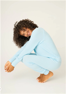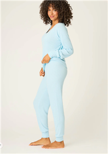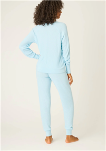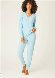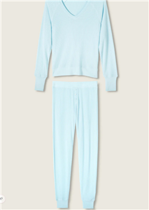Women’s sky-blue waffle lounge set in soft textured knit with a long-sleeve V-neck top and matching jogger pants.