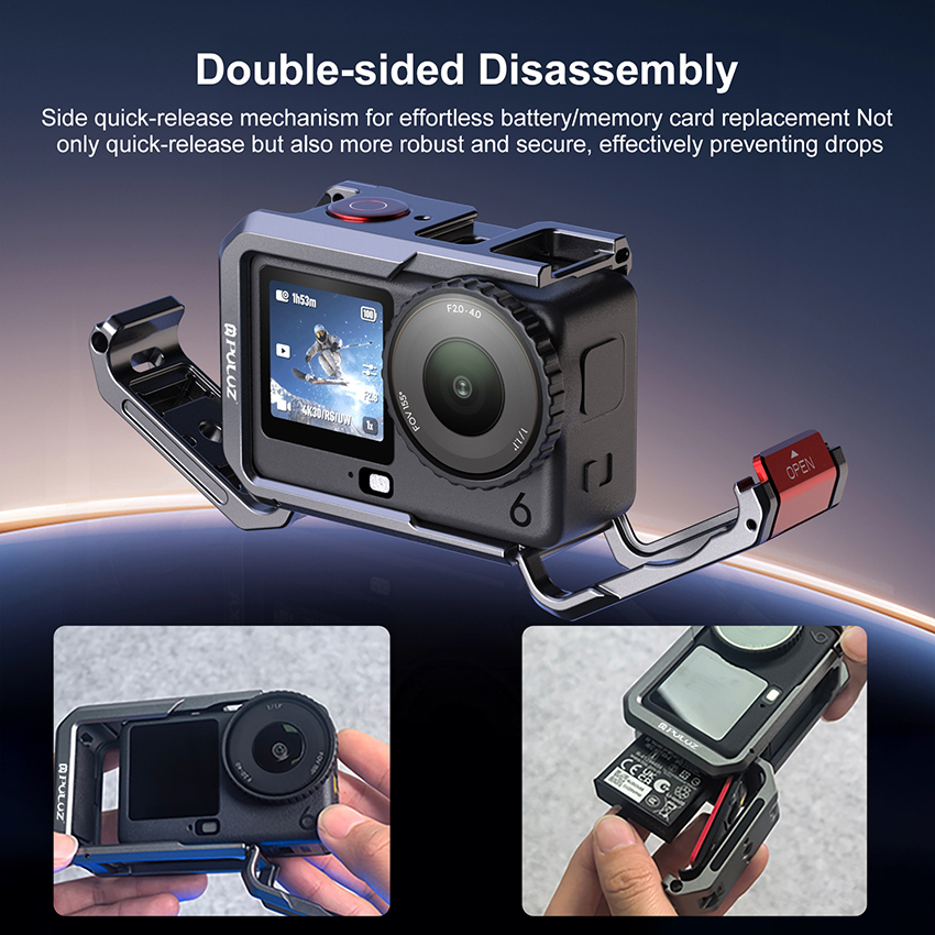 l Dual-Opening, No-Removal Battery Access: Independent battery compartment allows fast battery swaps without removing the cage. Side opening lets you access the camera even when using a shooting handle