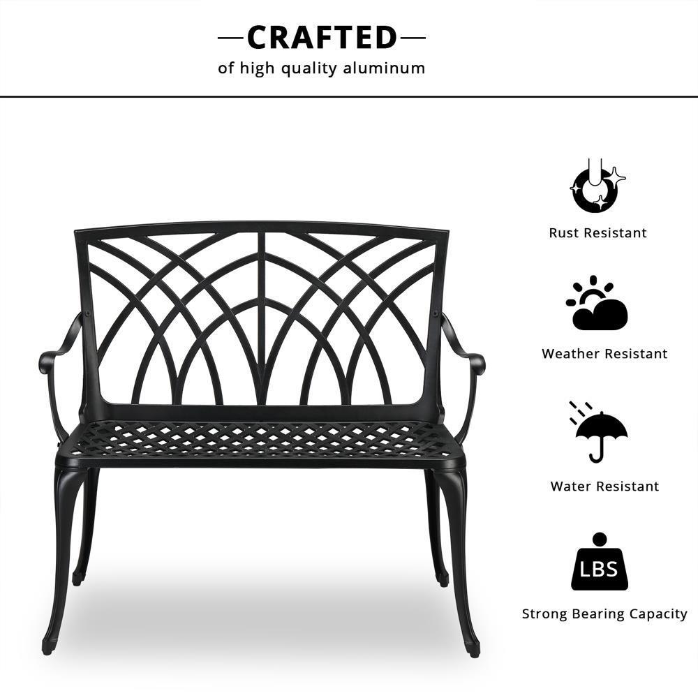 Here is our 38in Outdoor Orchid Back Aluminum Bench. Lounge comfortably or read a good book on this beautifully designed bench. It will fit perfectly on your backyard, porch, and path, or near your entrance and driveway. Antique style adds a touch of elegance to any outdoor area. Curved armrests with a sloped slatted seat offer optimal comfort. Powder-coat aluminum construction provides years of durability as well as easy maintenance. What are you still hesitating about? Order now!