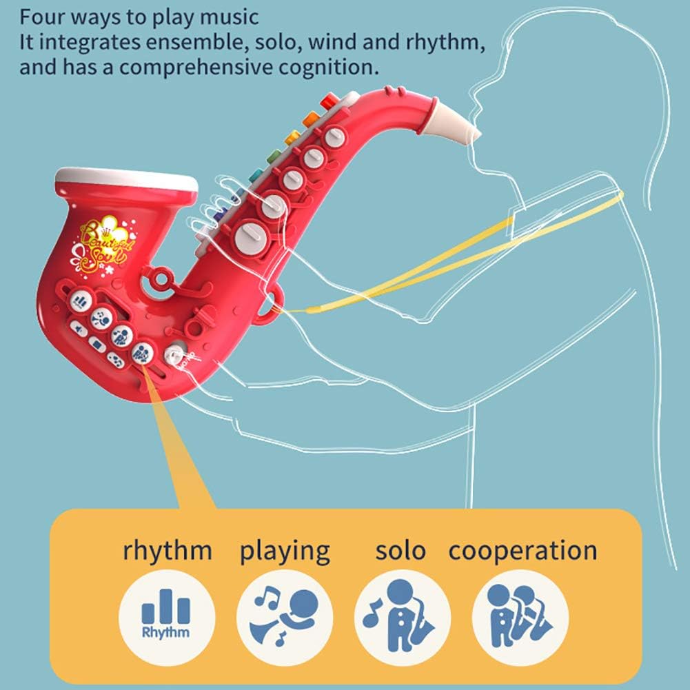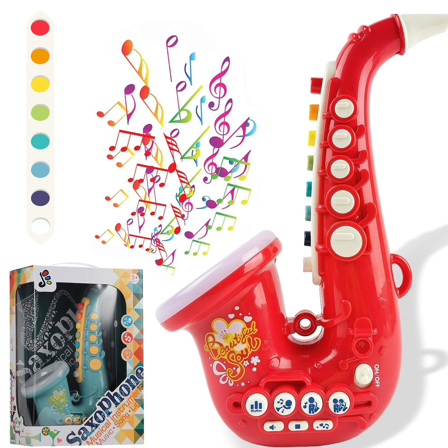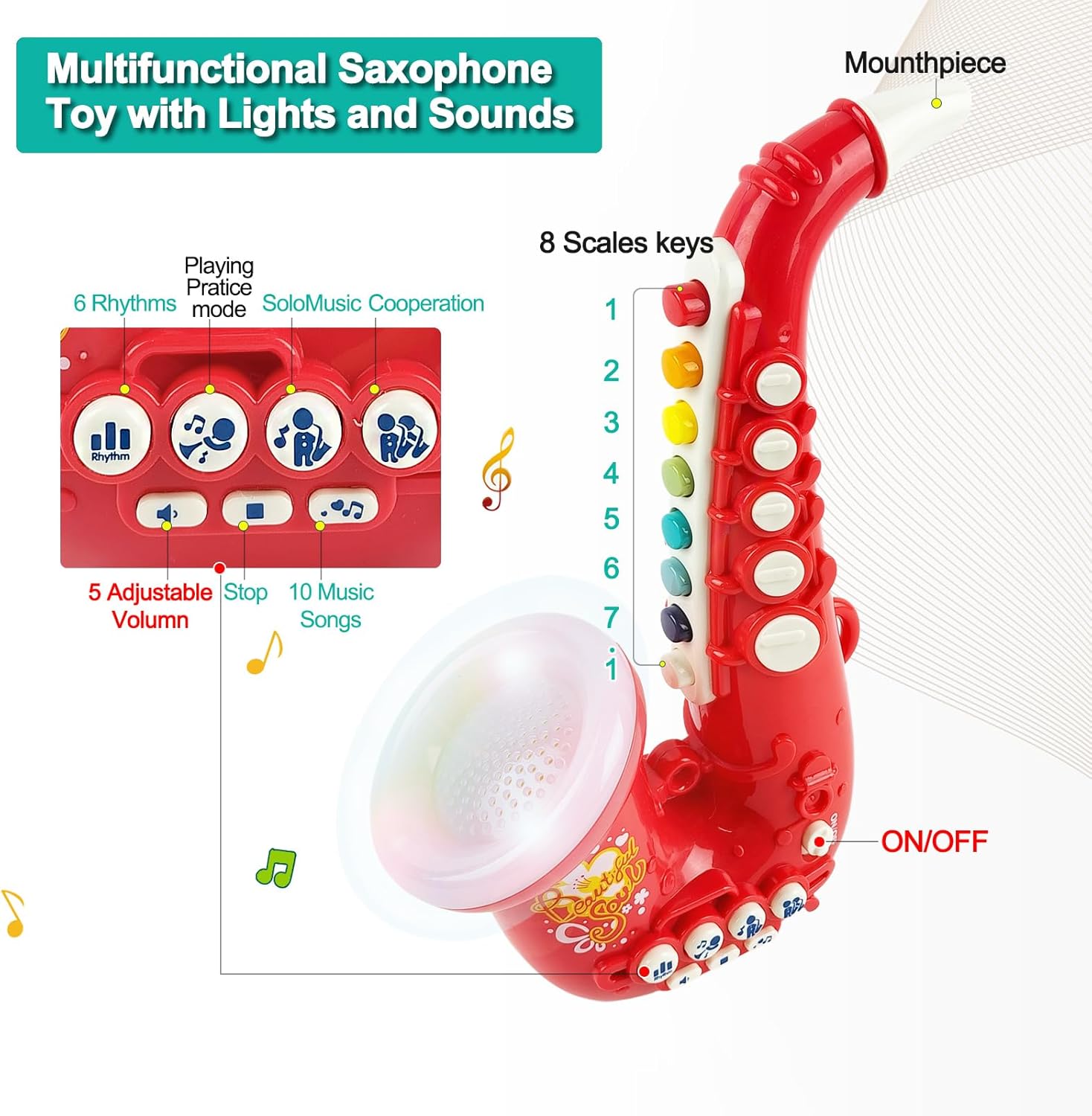 It is a saxophone toy featuring dynamic flashing lights, 8-note keys, 4 playing modes, 5 adjustable volume levels,
