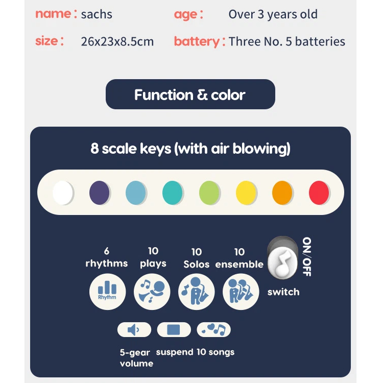 and the ability to automatically play music, allowing children to blow rhythms along with the tunes.