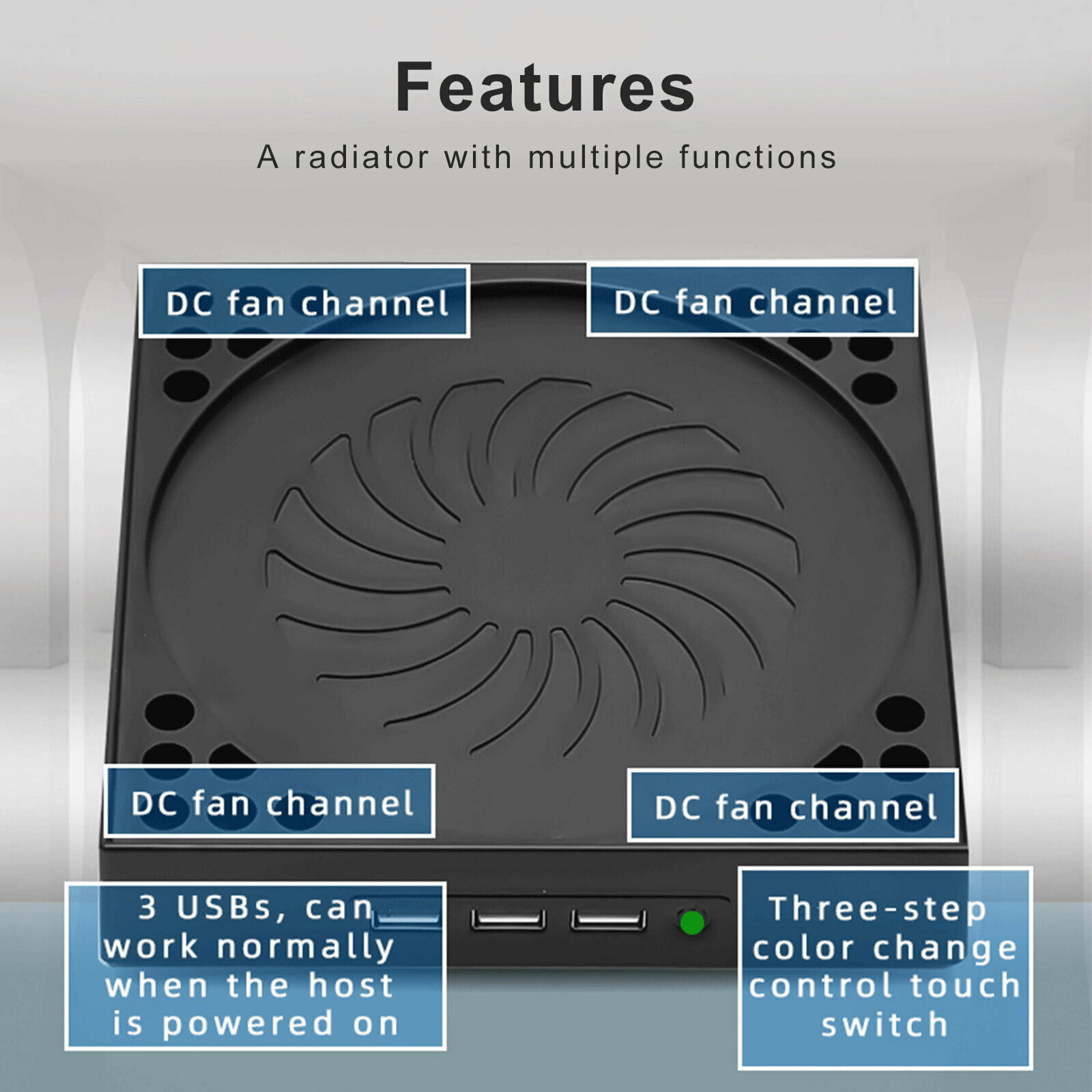 The touch switch has three gears, the speed of wind can be adjusted, and LED indicators of different colors show different states. Green light: high speed. Blue light: medium speed. Orange light: low speed