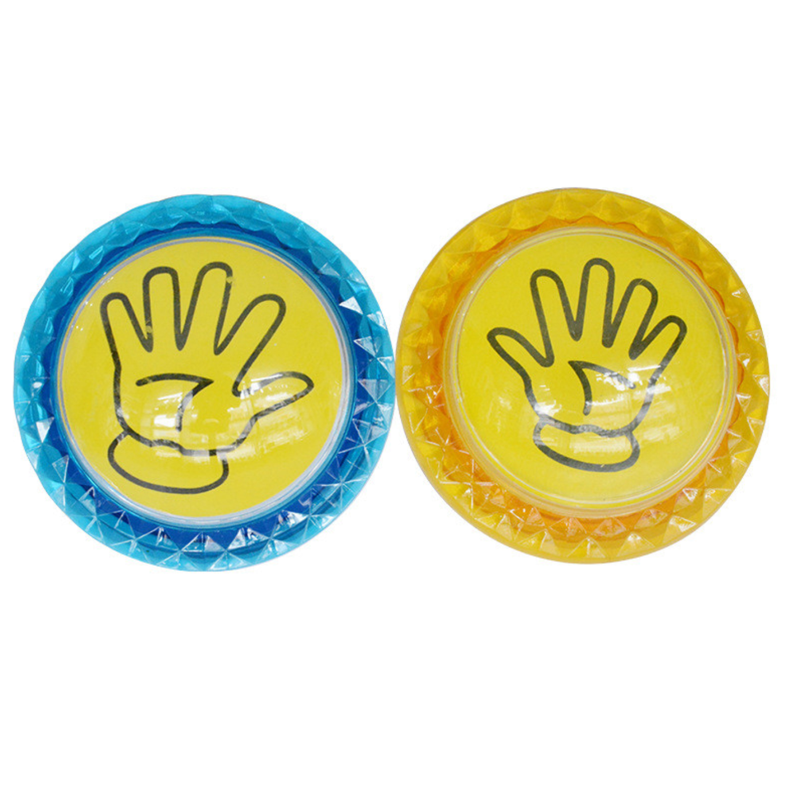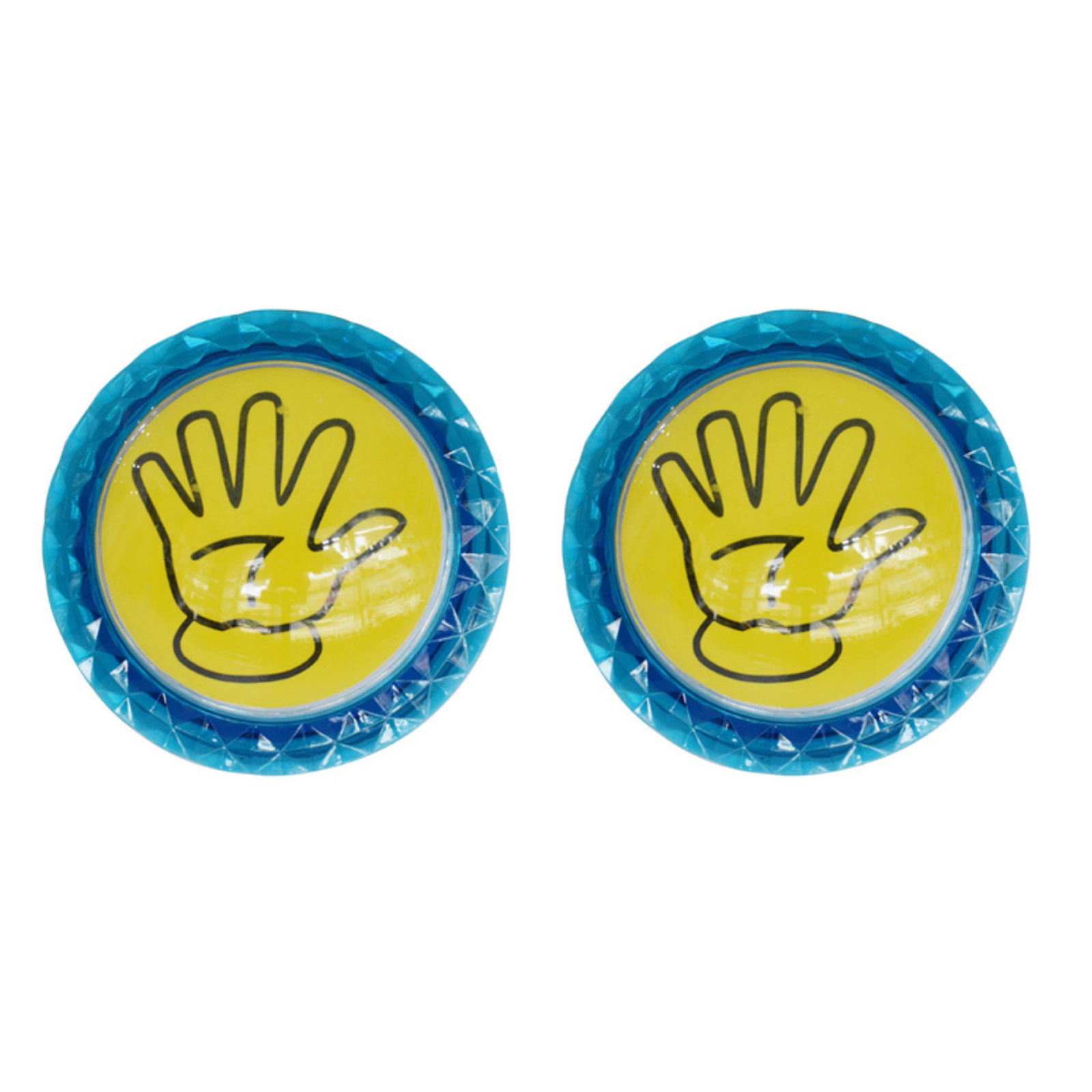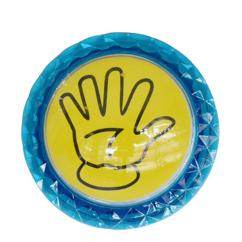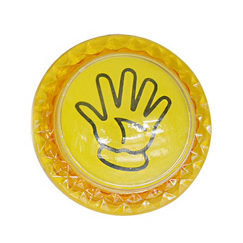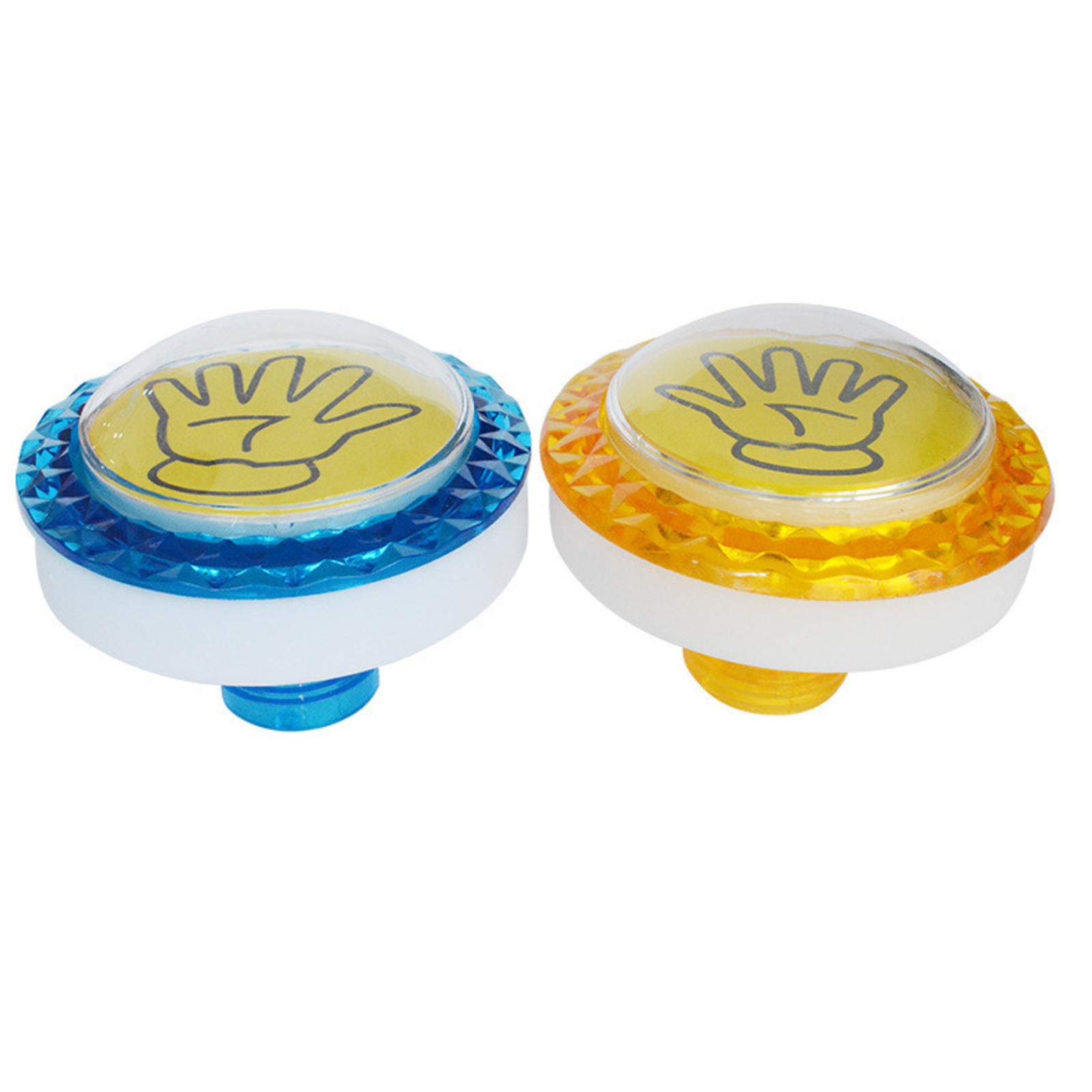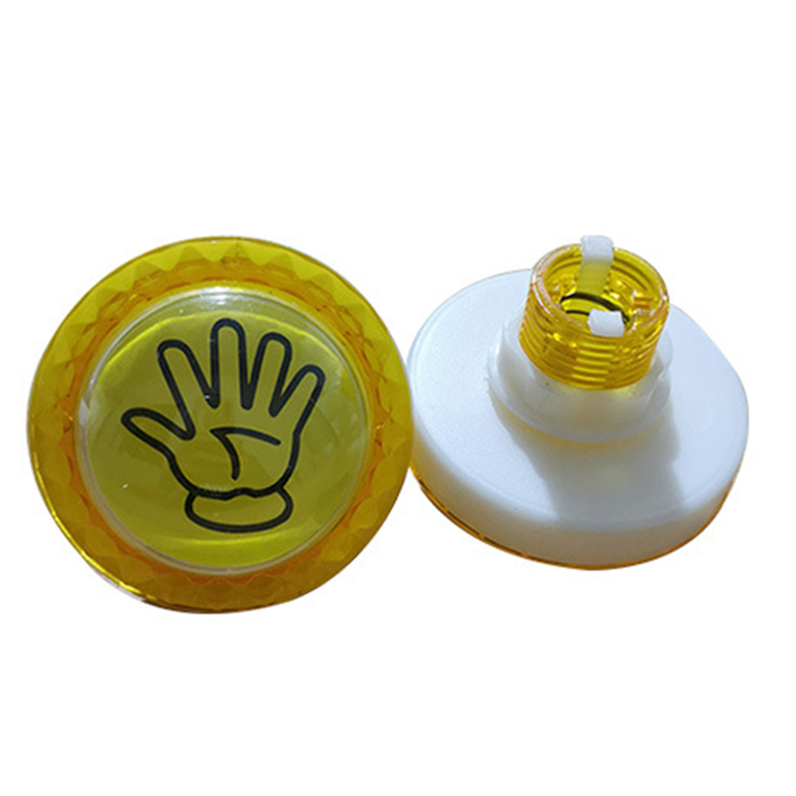 This button with a hand pattern has a domed plastic cover with a black retaining ring around it. There's a LED lamp included that will light up the button.