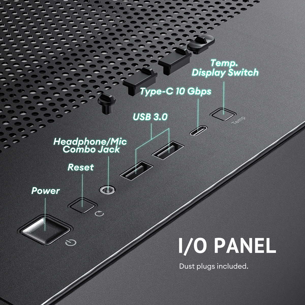 • Die linke Seitenwand verfügt über eine doppelte CPU/GPU-Temperaturanzeige mit einer zusätzlichen Temperaturregelungstaste auf dem E/A-Panel. Die doppelte Temperaturanzeige arbeitet mit der iUnity-Software von Antec für die Echtzeit-Überwachung der Hardwarekühlung, sodass Benutzer den Hardware-Status leicht verfolgen können.