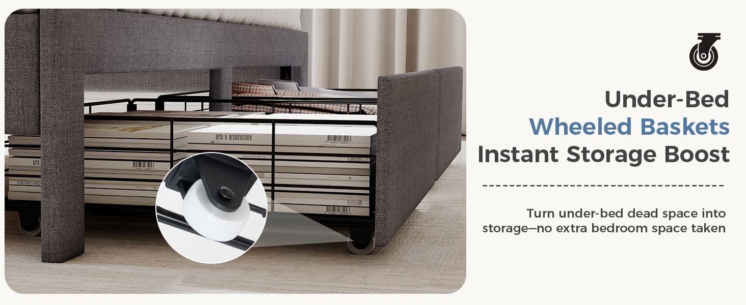 【Footboard Storage with 2 Metal Baskets】Declutter with unique footboard storage. Two wrought-iron baskets provide breathable, easy-access space for blankets, pillows, or books—a functional storage bed for Full, Queen, or King sizes.