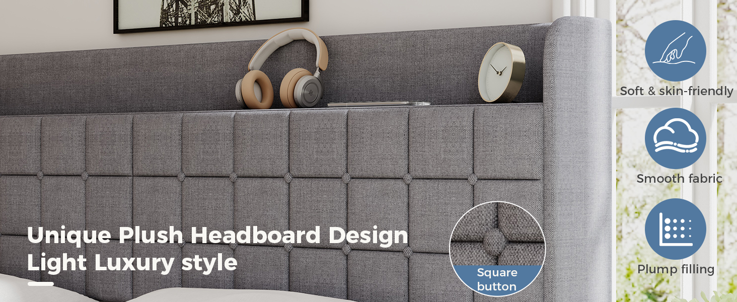 【Plush Upholstered Design】Experience lasting luxury. The fully upholstered platform bed frame is wrapped in soft fabric with a supportive channel-tufted headboard. This upholstered bed offers a comfortable backrest and a modern focal point.