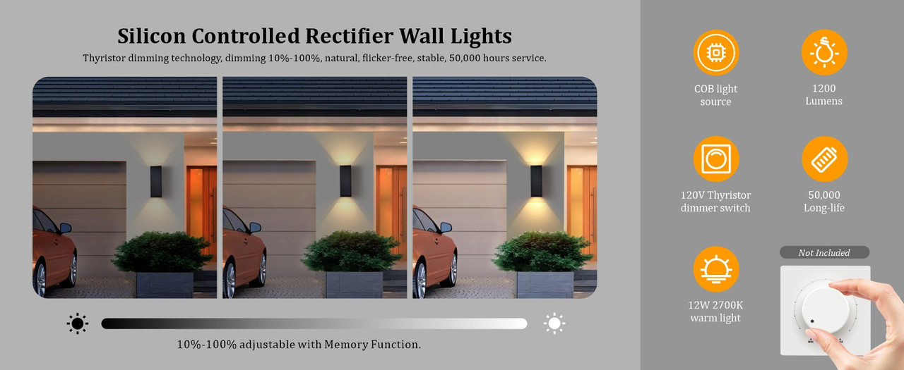 ✨✨Dimmable function: The brightness of this outdoor wall light can be finely adjusted from 10% to 100% using a compatible dimmable switch. (Note: The dimmable switch is not include in the package.) If no dimmable switch is used, the light will operate at its full brightness level.