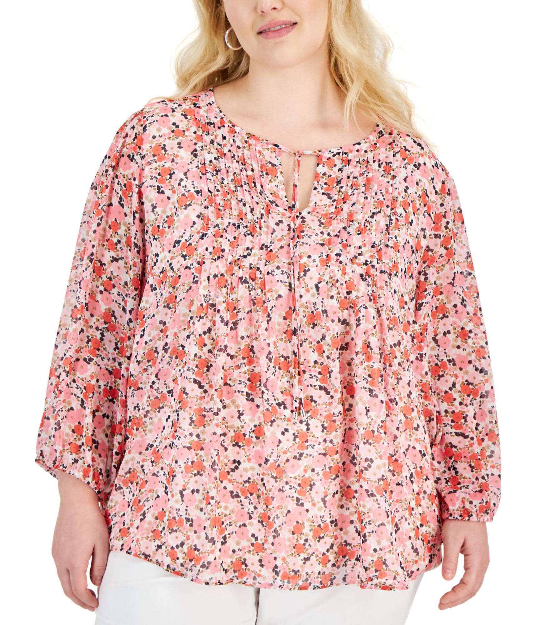 Tommy Hilfiger Womens Floral Pintucked Knit Blouse, white, 3X
