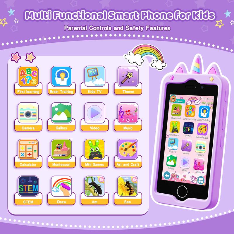 Comprehensive Learning and Fun Modules: Designed for kids aged 1-9, the kids phone toy includes a variety of educational and entertaining modules. It features Language, Numerical, Geometric, Music, and Puzzle Games. Pre-loaded with over 20 kids' apps, including Montessori and STEM series educational apps, AR Fun Game and essential tools like a music player, video player, recorder, calculator, calendar, alarm clock, and stopwatch, it offers a well-rounded learning and entertaining experience.