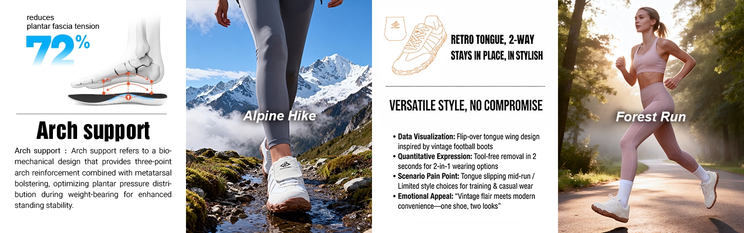 - 3D Arch Support for All-Day Endurance: 135% arch coverage disperses 72% plantar tension. Tri-support structure improves flat foot balance by 27% and relieves high arch by 33%. Walk 20,000 steps daily with fatigue-defying stability—your arches deserve this smart cradle.