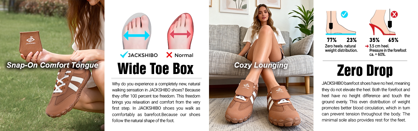JACKSHIBO shoes have been synonymous with zest for value health.Perfect footwear for people who value health and comfort.For people who want to concentrate on the beautiful things in life.Your feet feel the meaning of natural movement in JACKSHIBO shoes,enjoy absolute toefreedom, zeroheel,and maximum flexibility of the sole.Whether you need shoes for work,sports,or casual wear,JACKSHIBO offers the perfect blend of style and practicality.