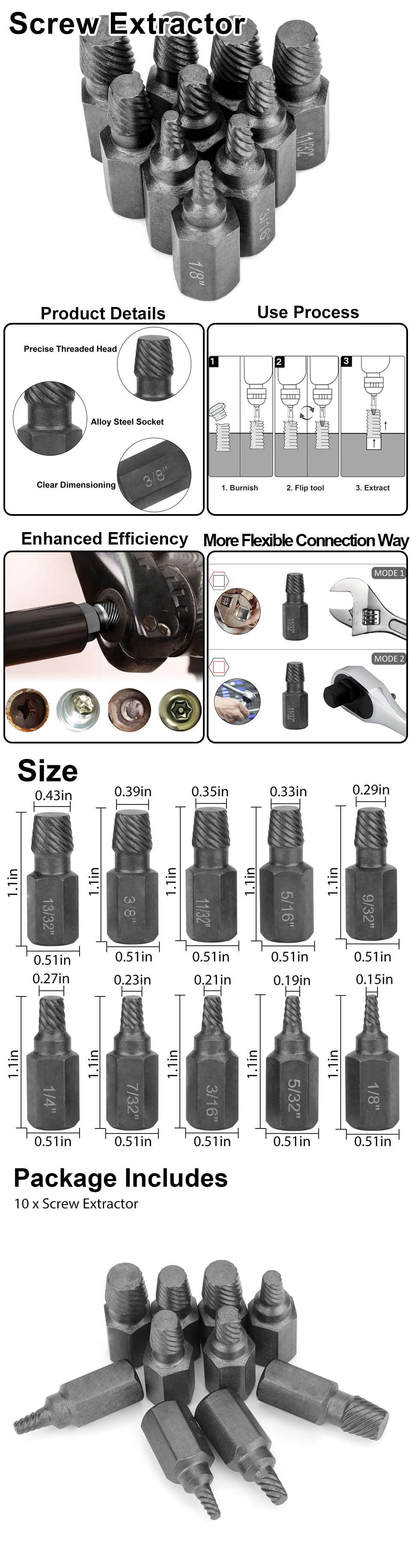 10-Piece Kit: The package includes 10 pieces of multi-spline screw extractors. And the size is 1/8, 5/32, 3/16, 7/32, 1/4, 9/32, 5/16, 11/32, 3/8, 13/32 inches.