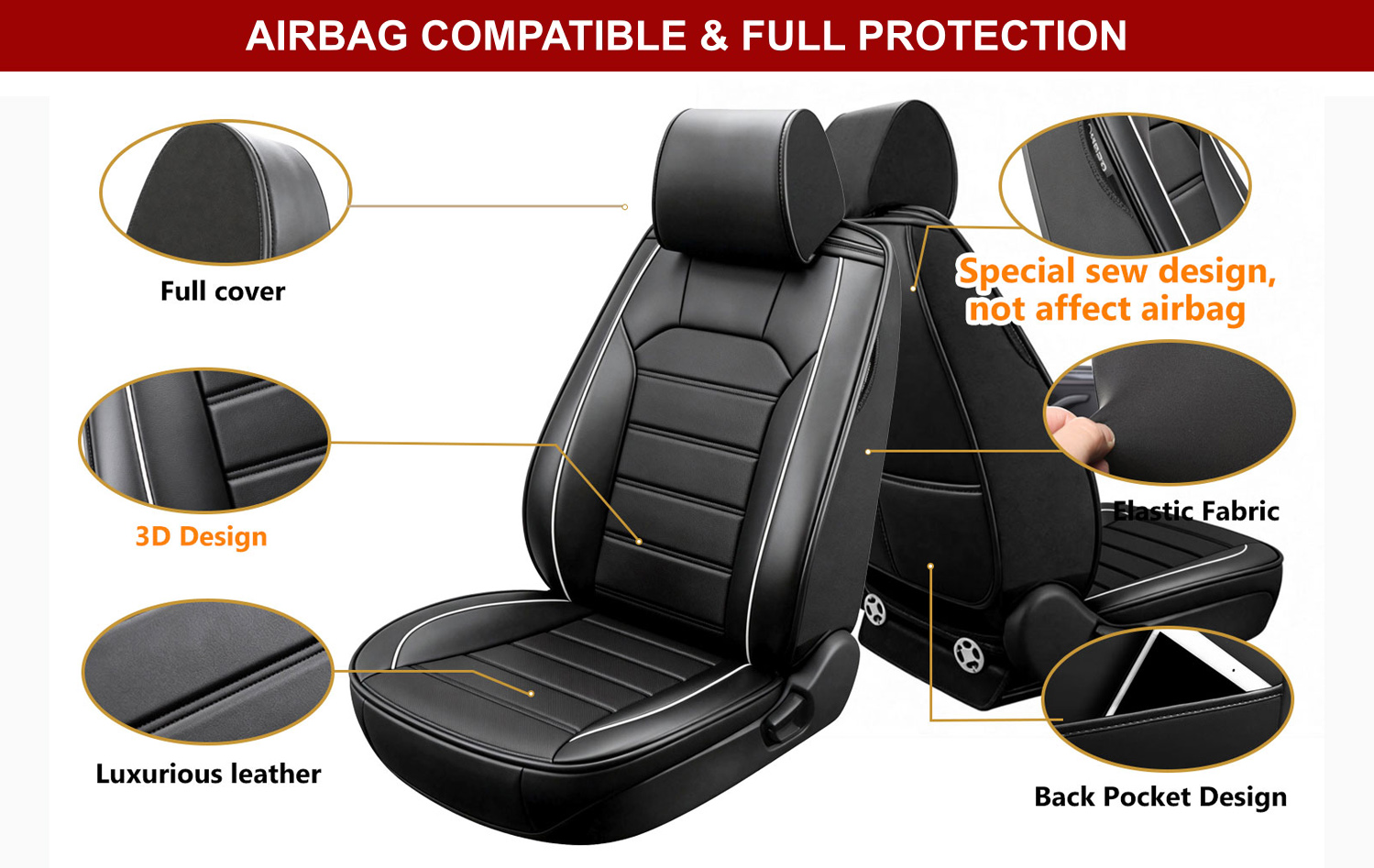 Tailored to all details of auto seat covers, not affecting the use of the airbag, safety belt, armrest, child carseat, seat adjustment and Heating and cooling.