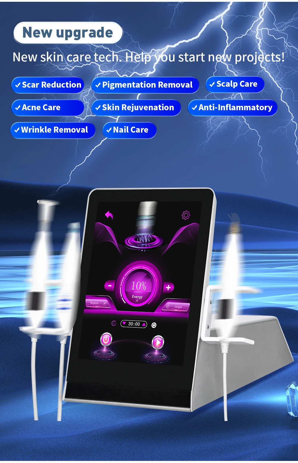 Utilizes low-temperature plasma generated by ionizing air and gas mixtures. When applied to the skin, it provides: