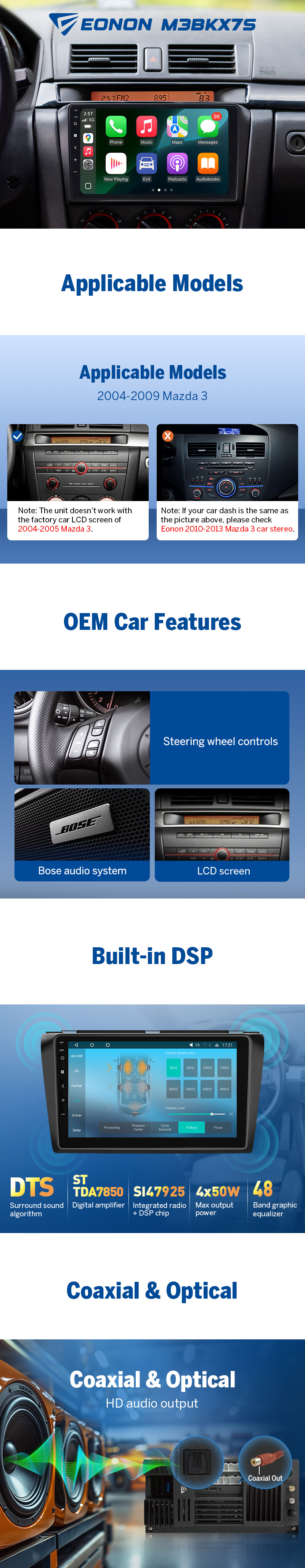 DSP Digital Amplifier A303 – recommended for audiophile upgrades ā FAQ š¹ Does it fit my Mazda 3? Yes. Built for Mazda 3 (2004–2009) with factory function retention. š¹ Is CarPlay & Android Auto wireless? Yes. Supports wireless & wired with fast auto-connect. š¹ Do I need a SIM card? Only for built-in 4G internet. CarPlay, Android Auto, GPS, radio & Bluetooth work without a SIM. š¹ Does GPS work without internet? Yes. Supports offline maps. š¹ Does Netflix work? No — DRM apps are blocked on all Android car stereos. YouTube & local video work normally. š¹ How good is the sound? 48-band DSP + digital outputs + 4×50W amp = true Hi-Fi quality. š¹ Does it overheat? No. 6-nm Qualcomm CPU + active cooling = stable even in hot climates. š¹ Can I add cameras & accessories? Yes — supports backup camera, dash cam, DAB+, OBD2 & more. š” Buy With Confidence ā Vehicle-specific factory fit ā Zero-risk plug-and-play installation ā All factory functions retained ā Premium components & long-term OTA support ā Heat-resistant, built for daily driving ā Money-back satisfaction guarantee Upgrade your Mazda 3 with confidence — Smarter, faster, clearer, and safer than stock. šāØ ā Vehicle Compatibility Designed for 2004 Mazda 3, 2005 Mazda 3, 2006 Mazda 3, 2007 Mazda 3, 2008 Mazda 3, 2009 Mazda 3. Plug & play. ā Specification - Operation system: Android 14
