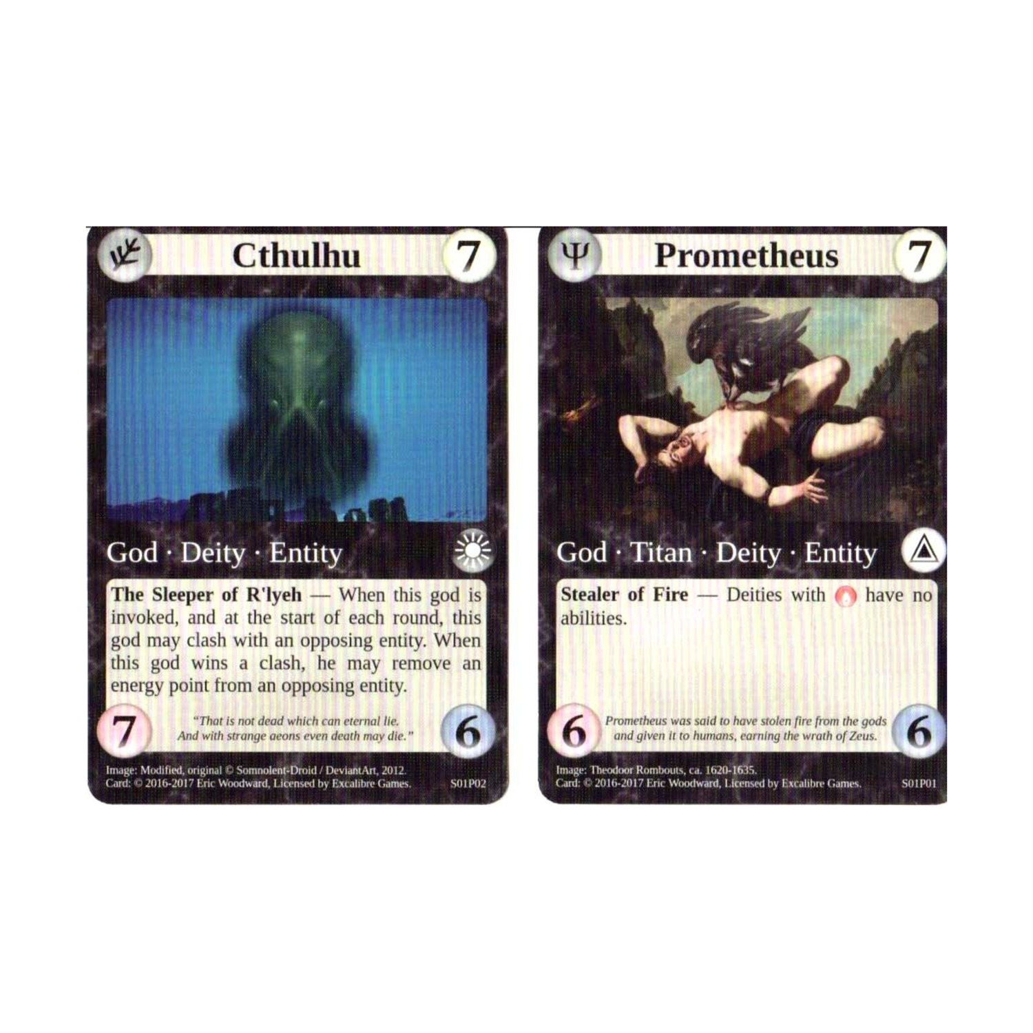 Mythic Wars - Cthulhu Rises is the first expansion set for Mythic Wars, which adds 16 new cards (8 gods and goddesses, and 8 creatures) based on the writings of HP Lovecraft. When combined with the Clash of the Gods base set, 4-8 players can join together and try and defeat the invading Outer Gods, including Azathoth, Nyarlathotep, Cthulhu, and many others. It’s an entirely new way to play Mythic Wars!