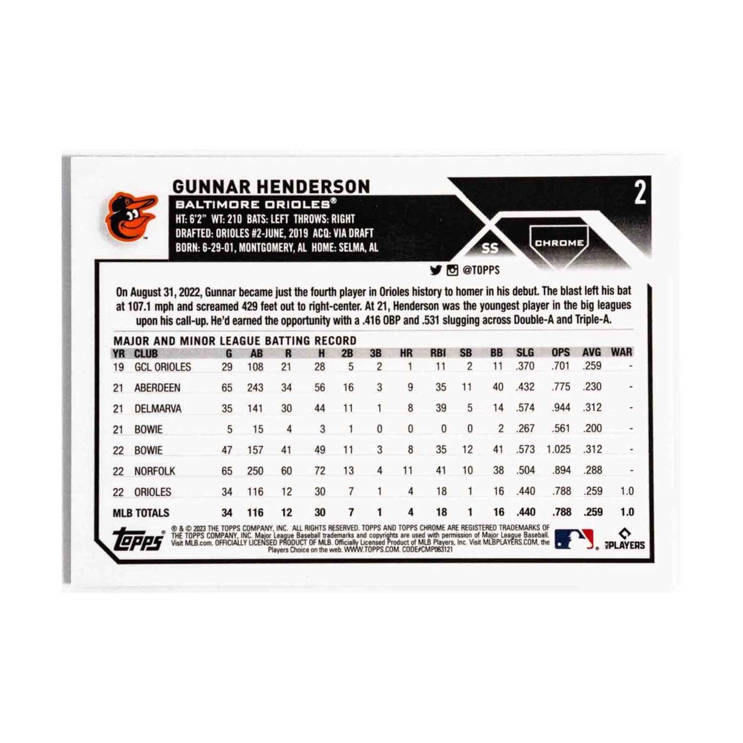 Gunnar Henderson - Rookie Card (Chrome Holofoil, 2) NM