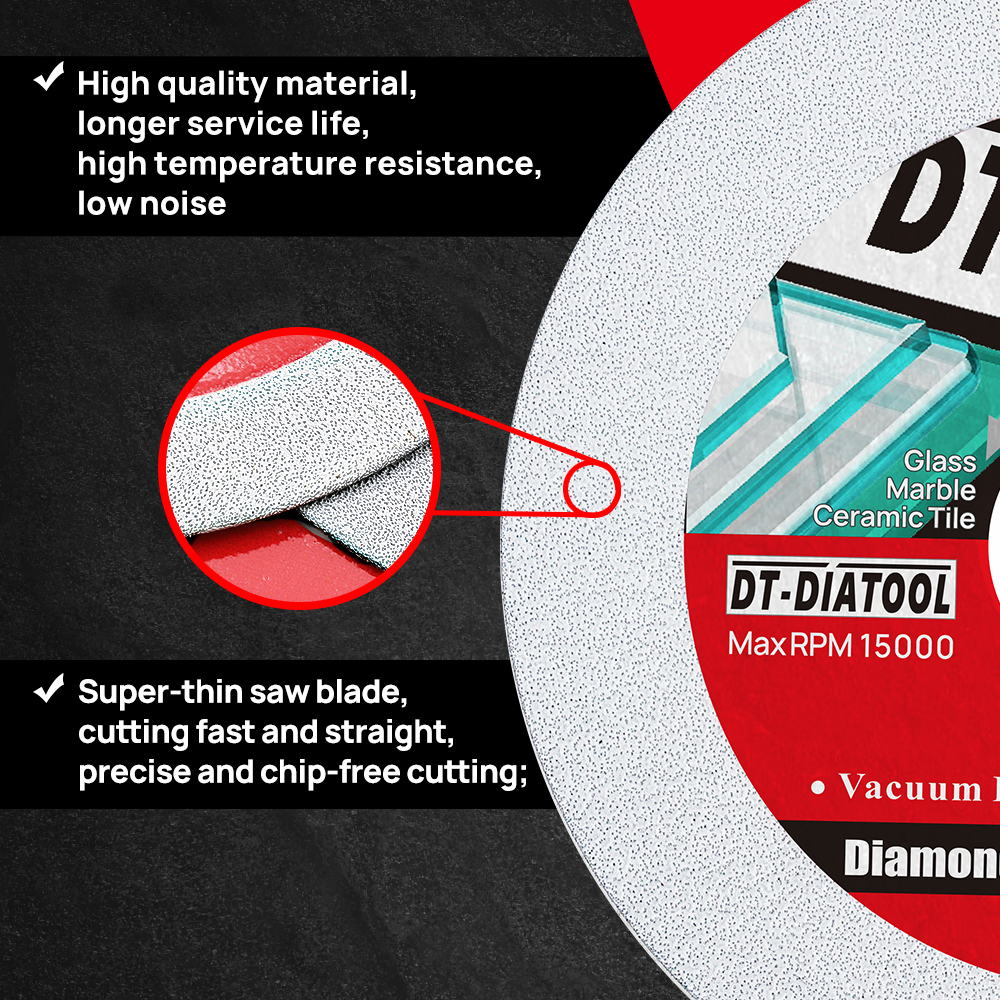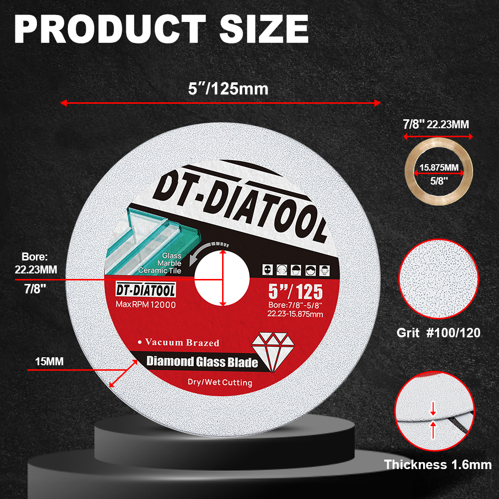 Artikel: Dt-DiatoolDia 125mm Diamant-Glass ch eiben scheibe Quantität:1pc/2pcs Grit#100/120 Spezifikation: Durchmesser 125mm:Segment dicke 1.6mm, Segment höhe: 15mm; Bohrung 22.23mm; Anwendung: Zum glatten Schneiden und Schleifen von Glas, Marmor, Fliesen, Jade, Kristall, Weinflaschen und anderen Materialien. Feature: 1, Tag Materialien von hoher Qualität, die Sägeblatt besteht aus hoher Qualität Diamant-und Stahl matrix, neue verbesserte Vakuum löte chno logie, längere Lebensdauer, hohe Temperatur beständigkeit und geringe Geräuschent wicklung; 2, i Qualität und Haltbarkeit, Kann lange Zeit schneiden, haltbarer und kosten günstiger erzielen; 3, USA Präzise Chipless Cutting, ultra dünnes Sägeblatt, schnelles und gerades Schneiden, sogar Schleif kraft, kann präzises, chiploses Schneiden erreichen;