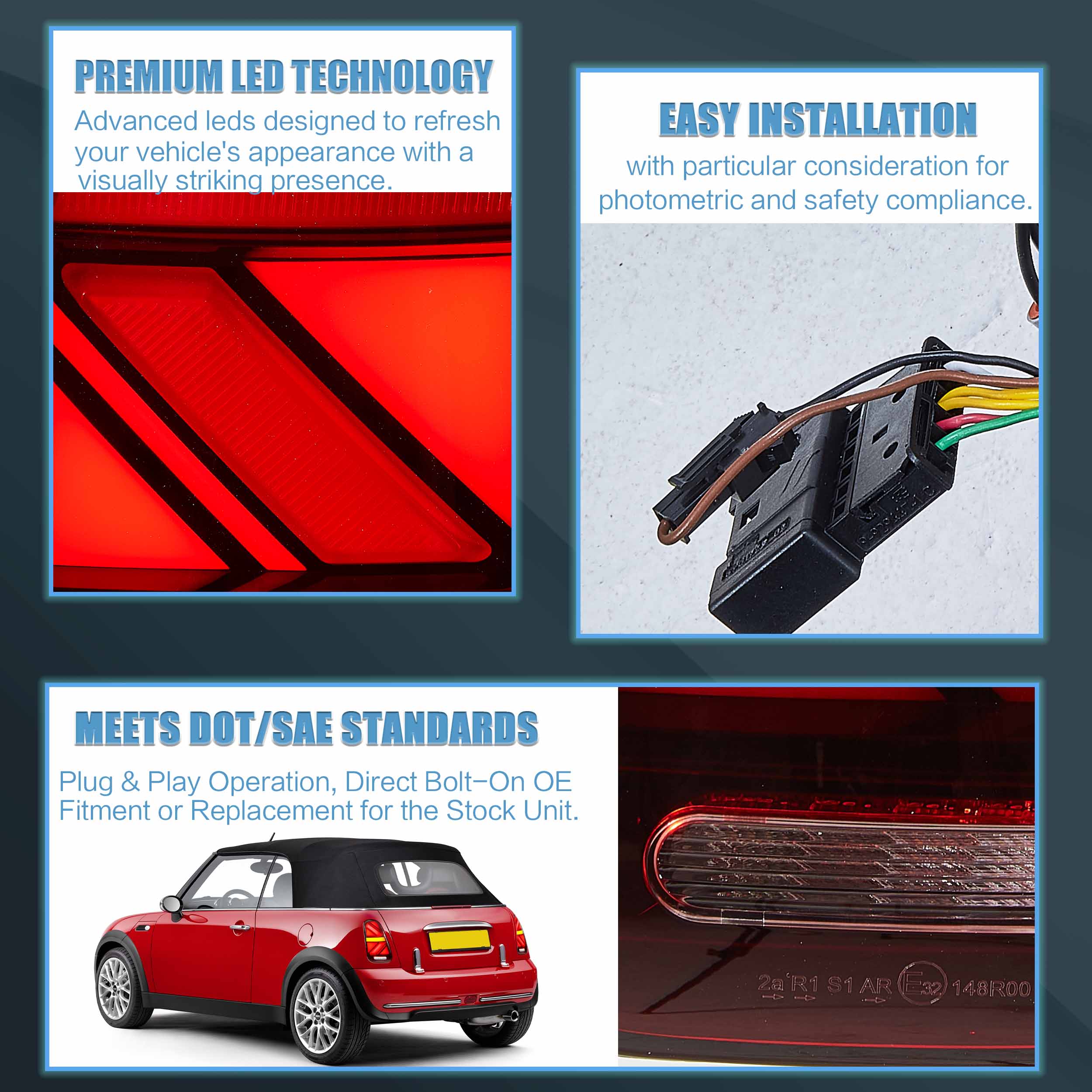 Dieser Artikel verfügt über die gleichen Anschlüsse und Kabel wie die Original-Rücklichter. Die Installation ist einfach, dennoch wird eine professionelle Installation empfohlen.