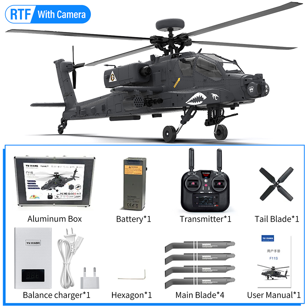 YuXiang F11S Apache AH-64 GPS-stabilisierter RC-Helikopter. Er verfügt über ein Design ohne Querruder mit zweiachsigen koaxialen Antriebsmotoren für präzise Steuerung. Enthält intelligente Flugsteuerung mit GPS-Stabilisierung und barometrischer Höhenhaltung. Verwendet Laserradar und optischen Abwärtsfluss für stabile und genaue Höhensteuerung. Ausgestattet mit 4,3 g schweren digitalen Metallservos und einer neuen hochpräzisen 9-Kanal-Fernbedienung.