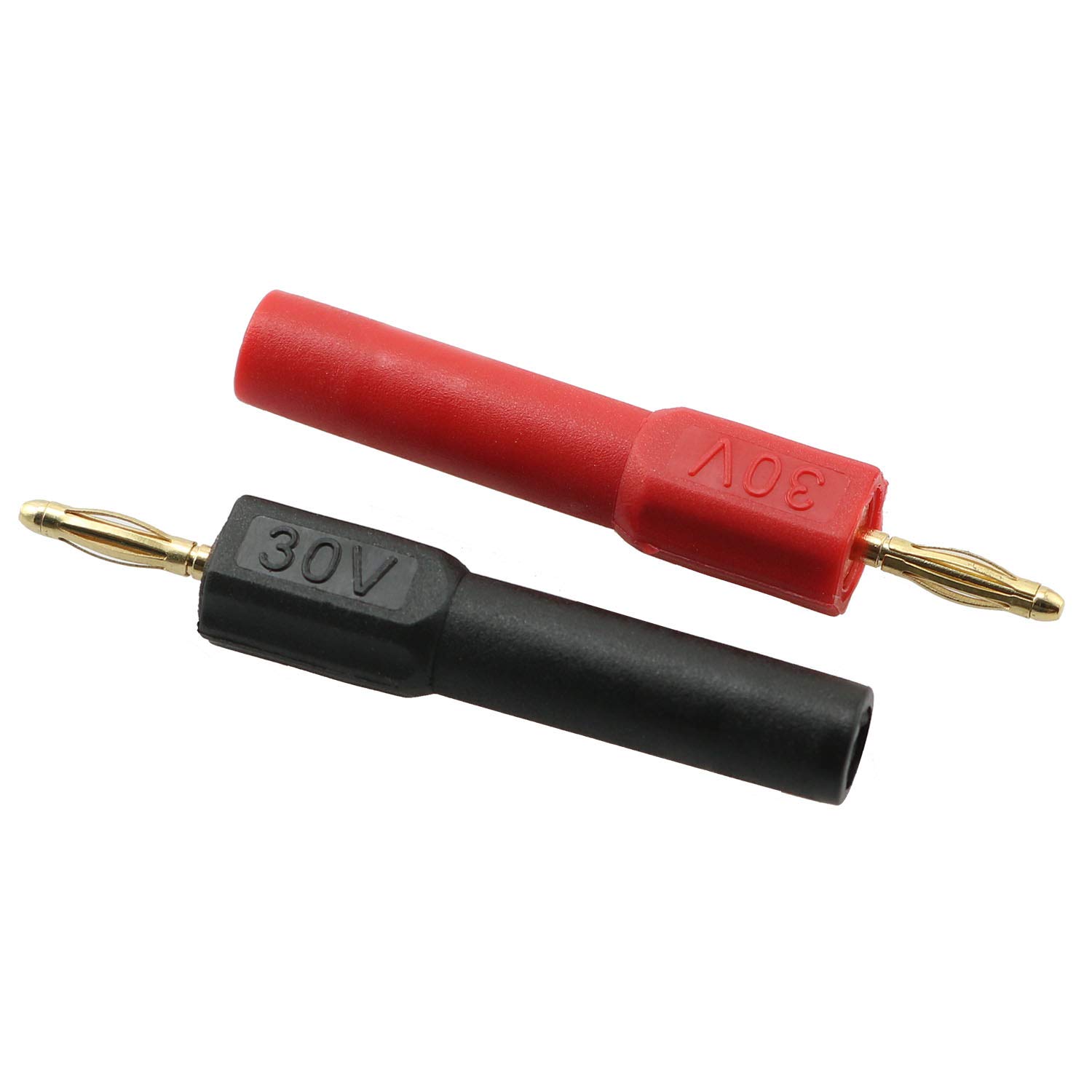 Color: black + redMaterial: PA cover, gold plated brass.The head is a gold-plated 2mm male banana plug and the tail is a 4mm banana socket. The tail can be plugged into all standard 4mm sheathed or non-sheathed banana plugs.