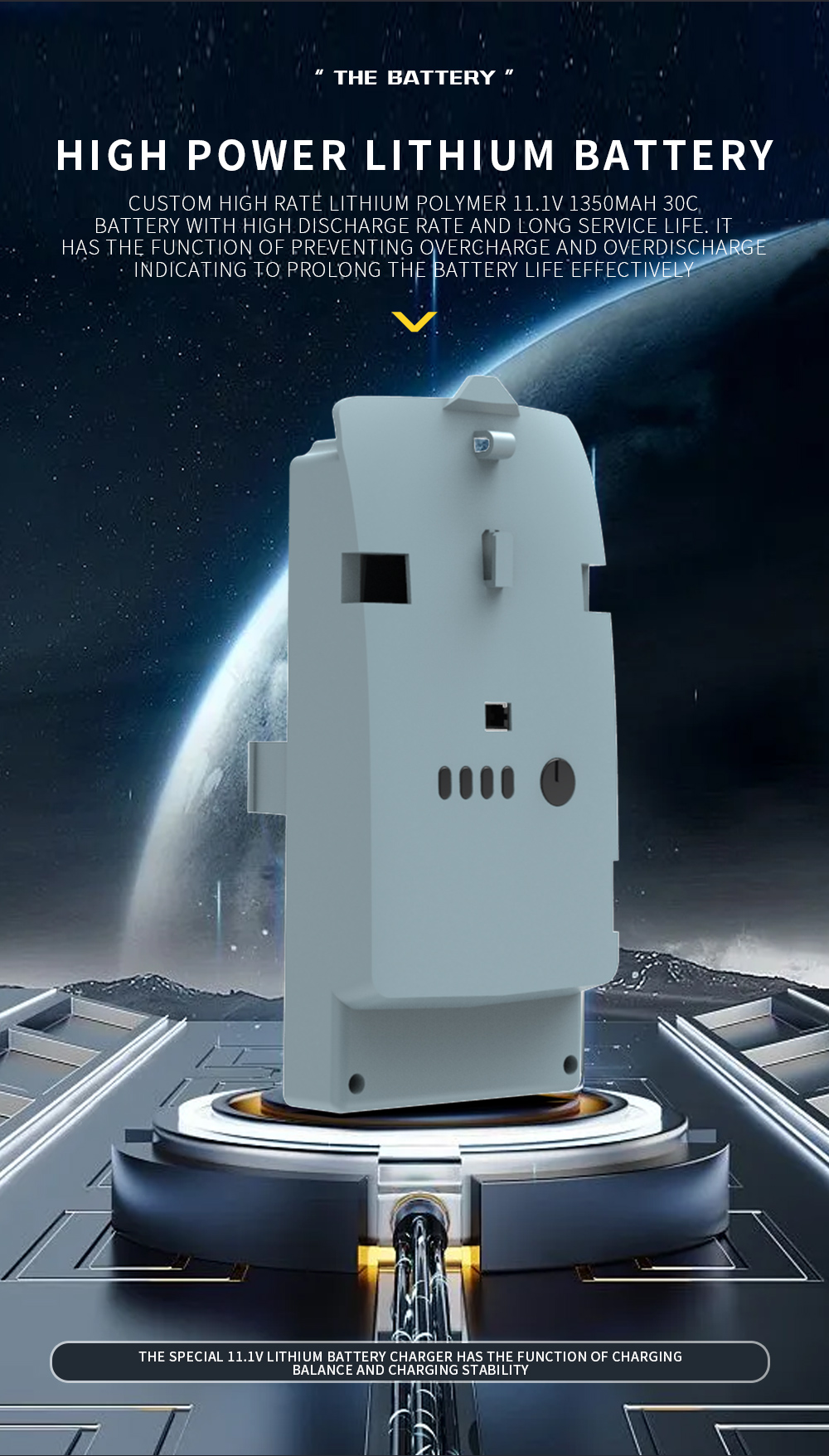 12. Ein speziell angefertigter, leistungsstarker Lithium-Polymer-Akku (LiPo) mit 11,1 V, 1350 mAh und einer Entladerate von 30C. Er bietet eine hohe Stromabgabe, eine lange Lebensdauer und ermöglicht eine Flugzeit von ca. 9 bis 12 Minuten. Bei ordnungsgemäßer Nutzung sind mehr als 500 Ladezyklen möglich. Der Akku verfügt über integrierte Schutzfunktionen gegen Überladung und Tiefentladung sowie eine Warnanzeige bei niedrigem Ladestand, was seine Lebensdauer effektiv verlängert.