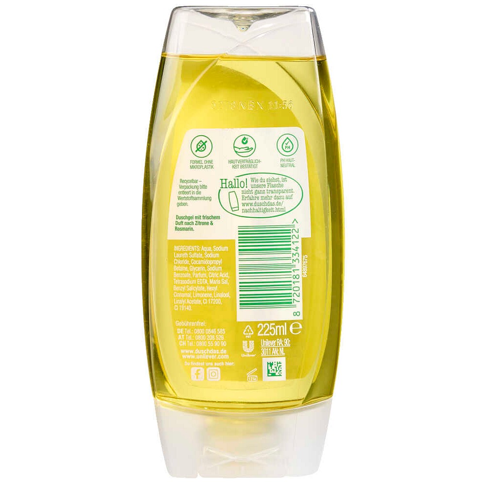 Erleben Sie revitalisierende Frische jeden Tag – bestellen Sie das duschdas Zitrone Rosmarin Duschgel 225 ml in unserem Onlineshop und tanken Sie neue Energie für Ihre Abenteuer.