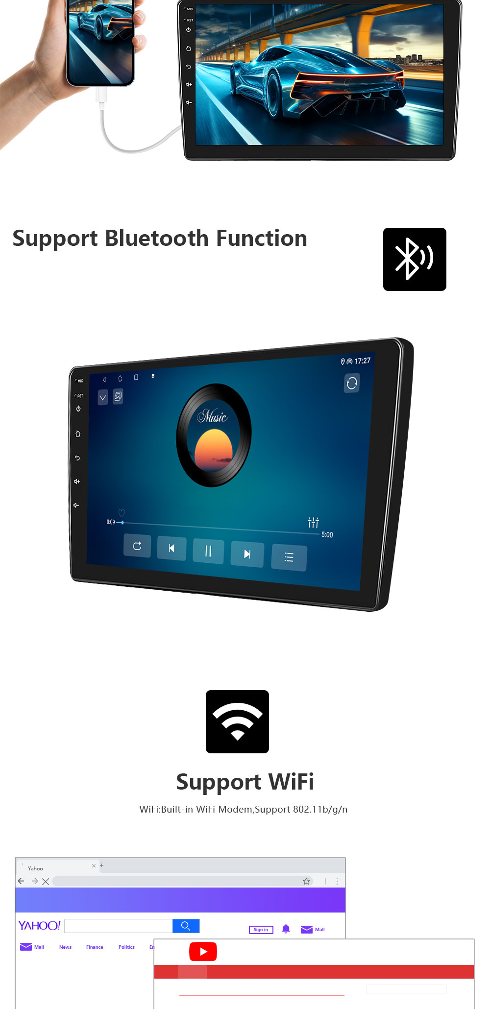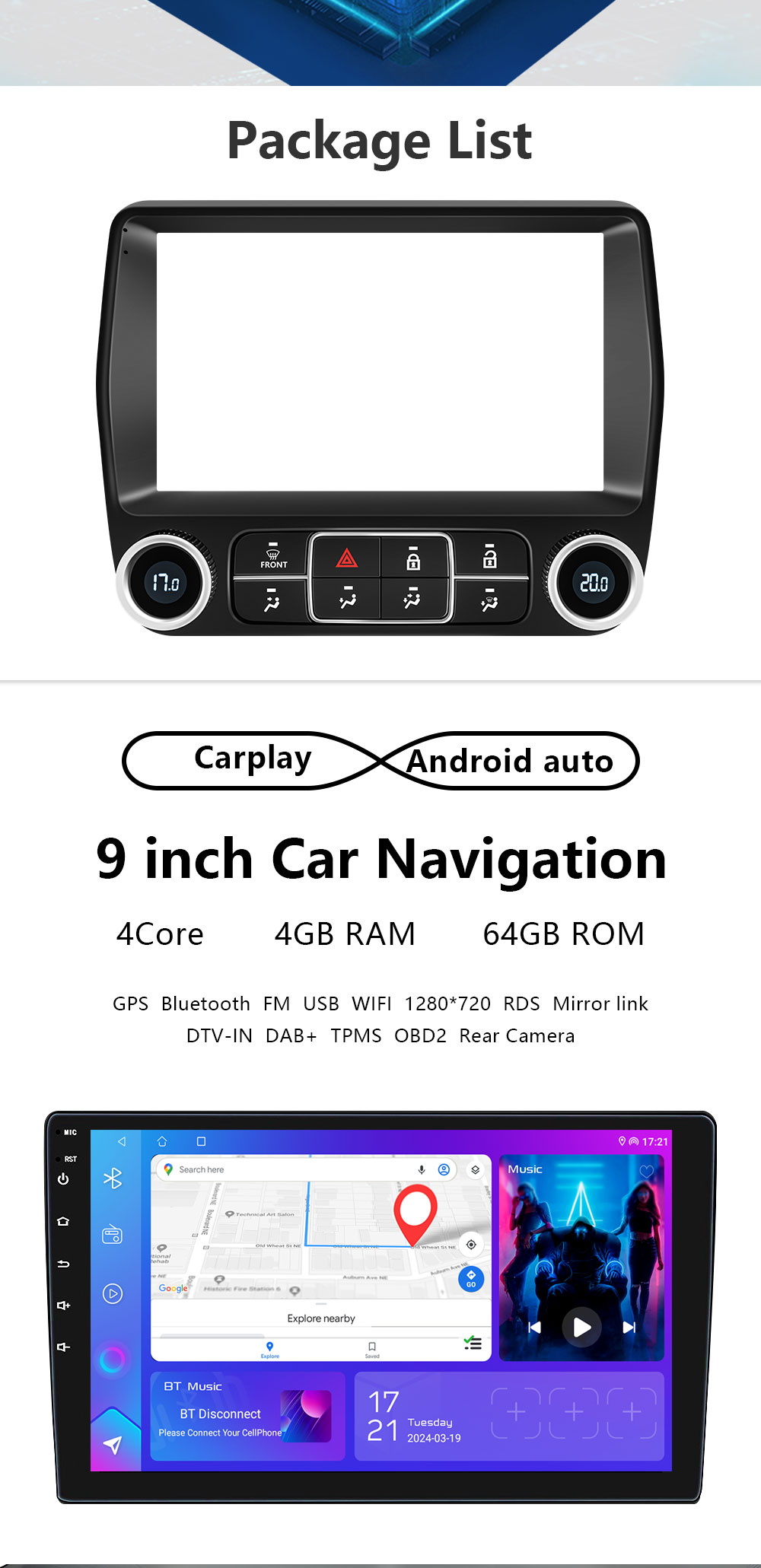 ● Wireless Android auto: The Wireless Android auto car system can closely integrate the user's Android phone and player, and realize navigation, make calls, send and receive information, listen to music and other operations through data cable connection;