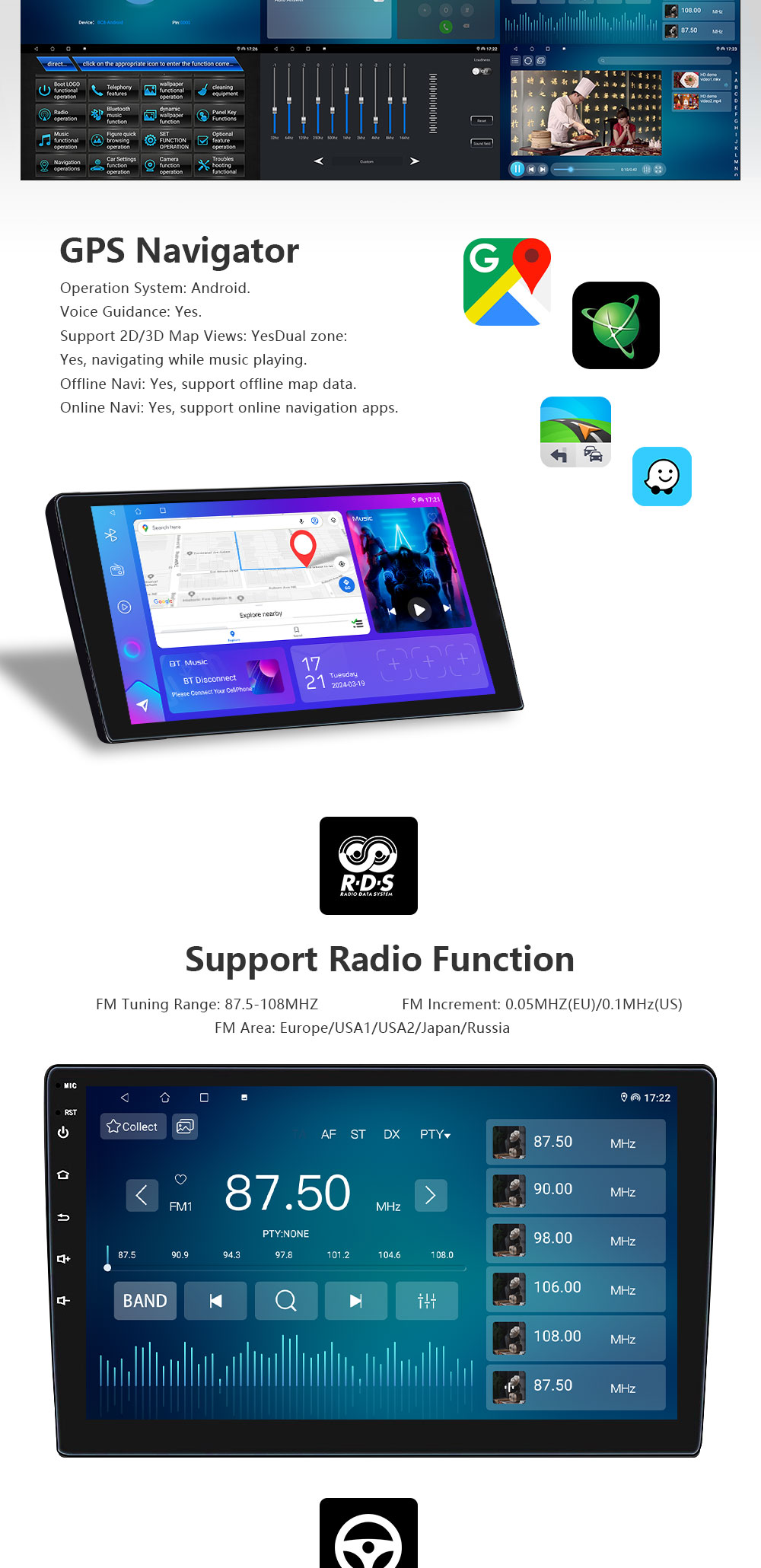 ●FM Radio: Online music you can transfer the music to the car stereo by FM to enjoy the original car stereo sound,with 18 preset stations