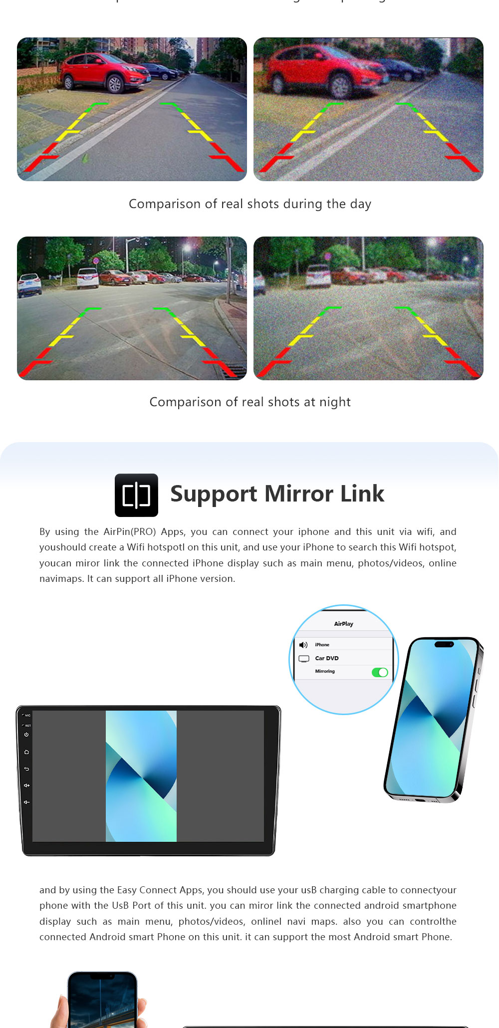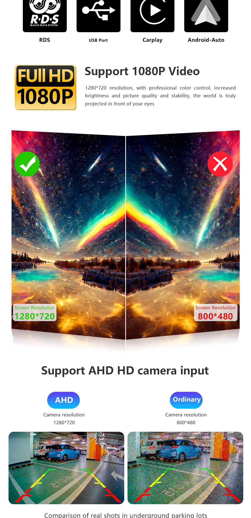 ●Rear camera: support AHD high-definition 720P camera image input,you can switch between CVBS and AHD simply by choosing in the settings(requires optional)