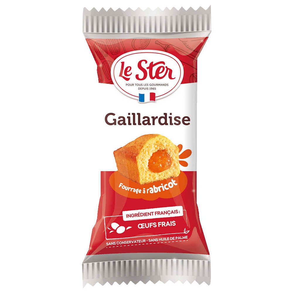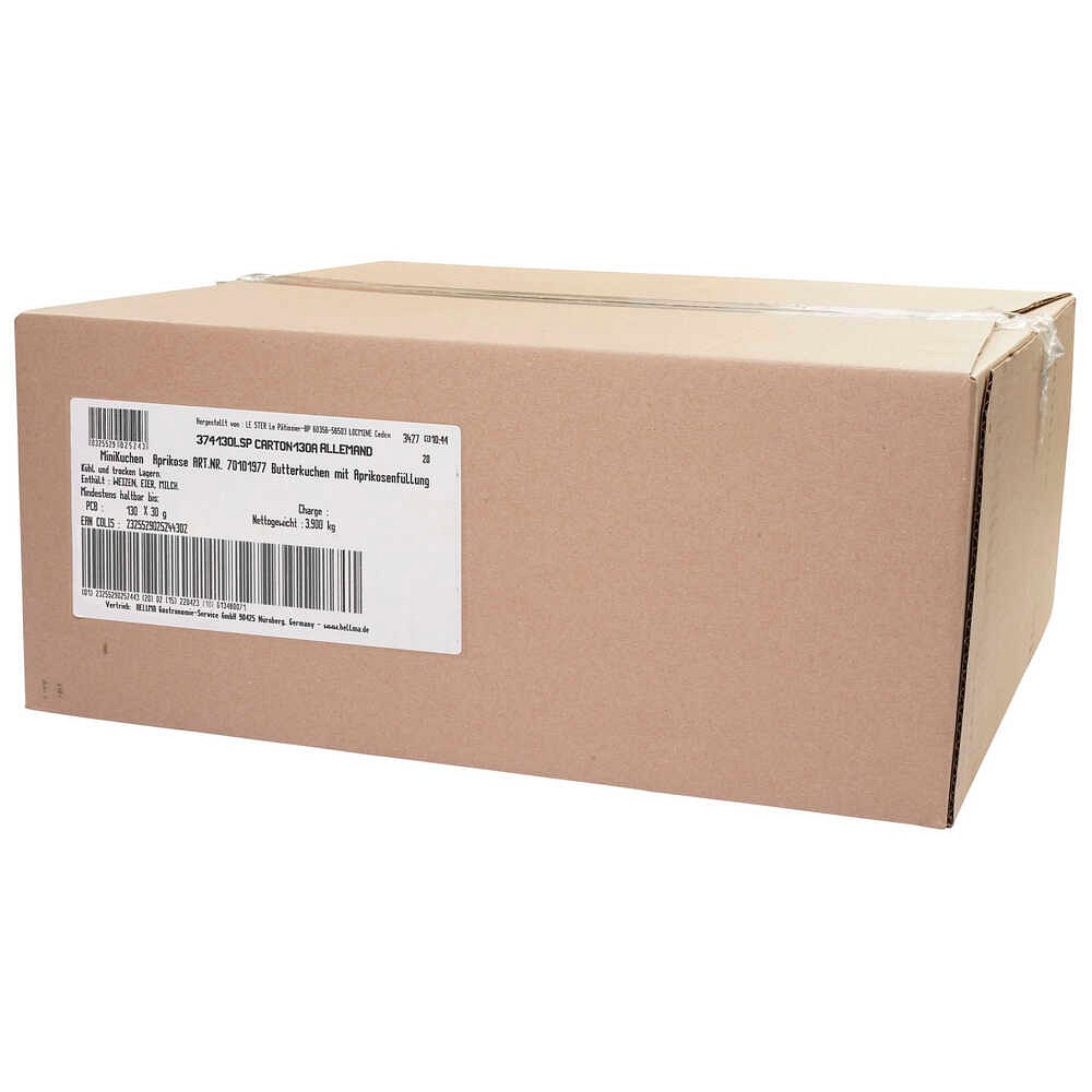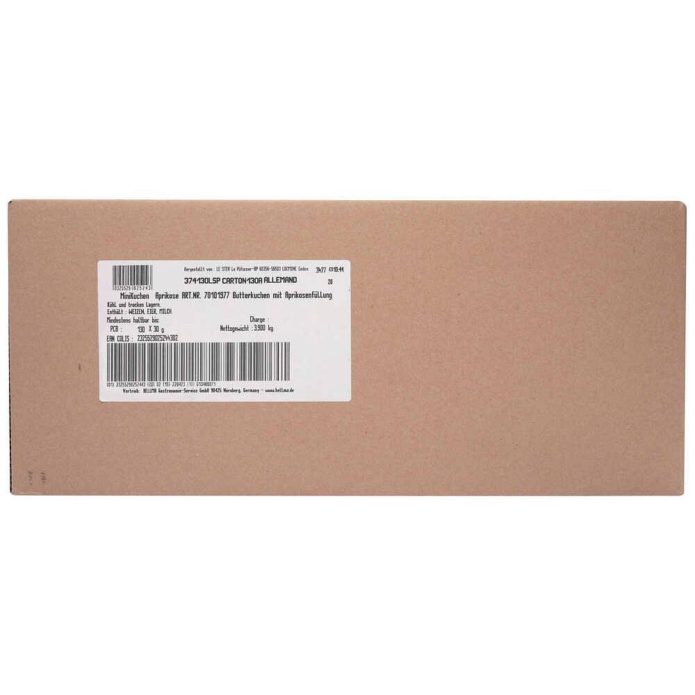 | Zutatenverzeichnis | Gebäck (75%): WEIZENmehl, Zucker, EIER, BUTTER 13%, Glukose-Fructose-Sirup, Stabilisator: Glycerin; Dextrose, Backtriebmittel: Diphosphat, Natriumcarbonat; Stärke, natürliches Aroma, Salz.Aprikosenfüllung (25%): Zucker, rekonstruiertes Aprikosenmark 24% (entspricht 40% von Früchten), Glukose-Fructose-Sirup, Geliermittel: Pektin; Säuerungsmittel: Milchsäure; Aroma, Salz, Farbstoff: E163. |
