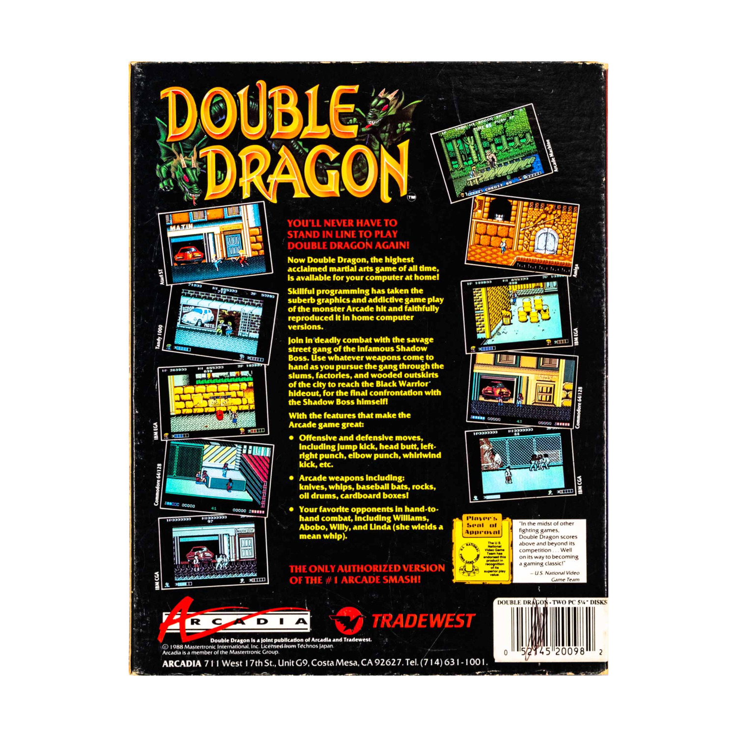 Double Dragon, the acclaimed martial arts arcade game, is now available for your computer at home on two 5 1/4" disks.