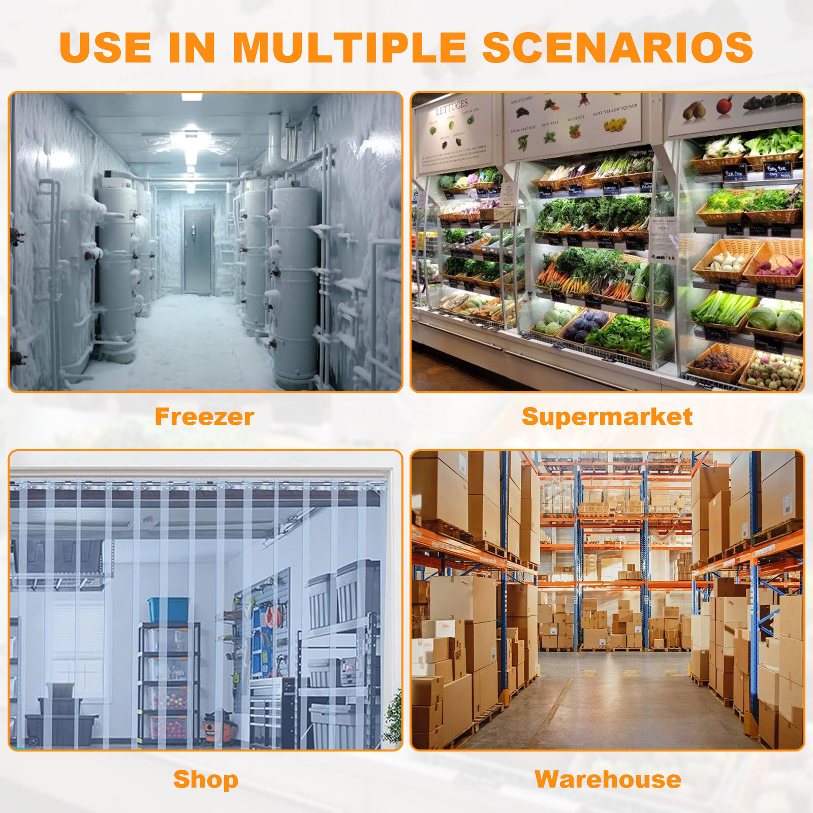 These PVC strip curtains are ideal for warehouses, factories, supermarkets, shopping malls and lobbies, ideal for any space that requires temperature control and environmental protection. Adaptable to a variety of environments, their versatility makes them a must-have for any business or facility.