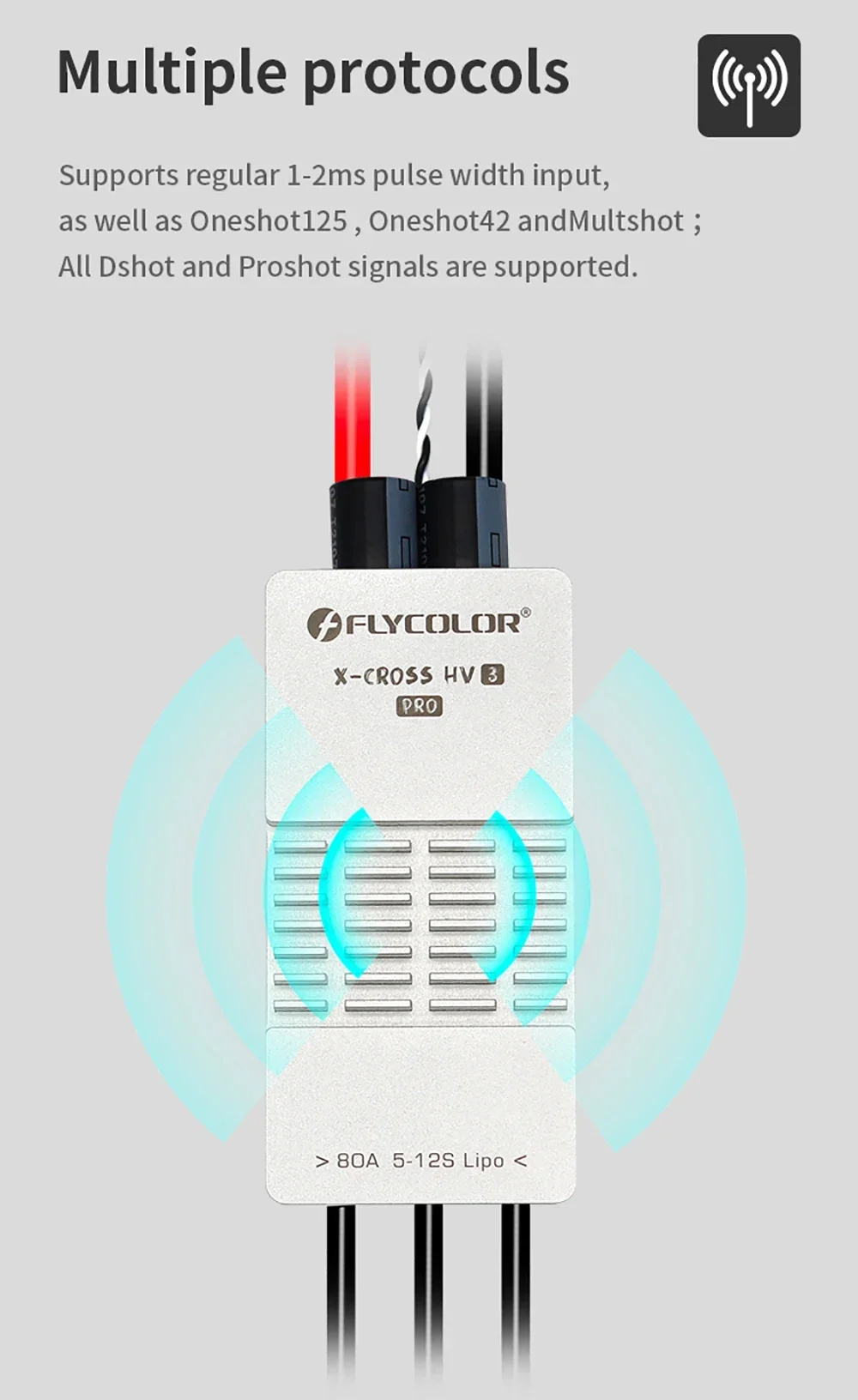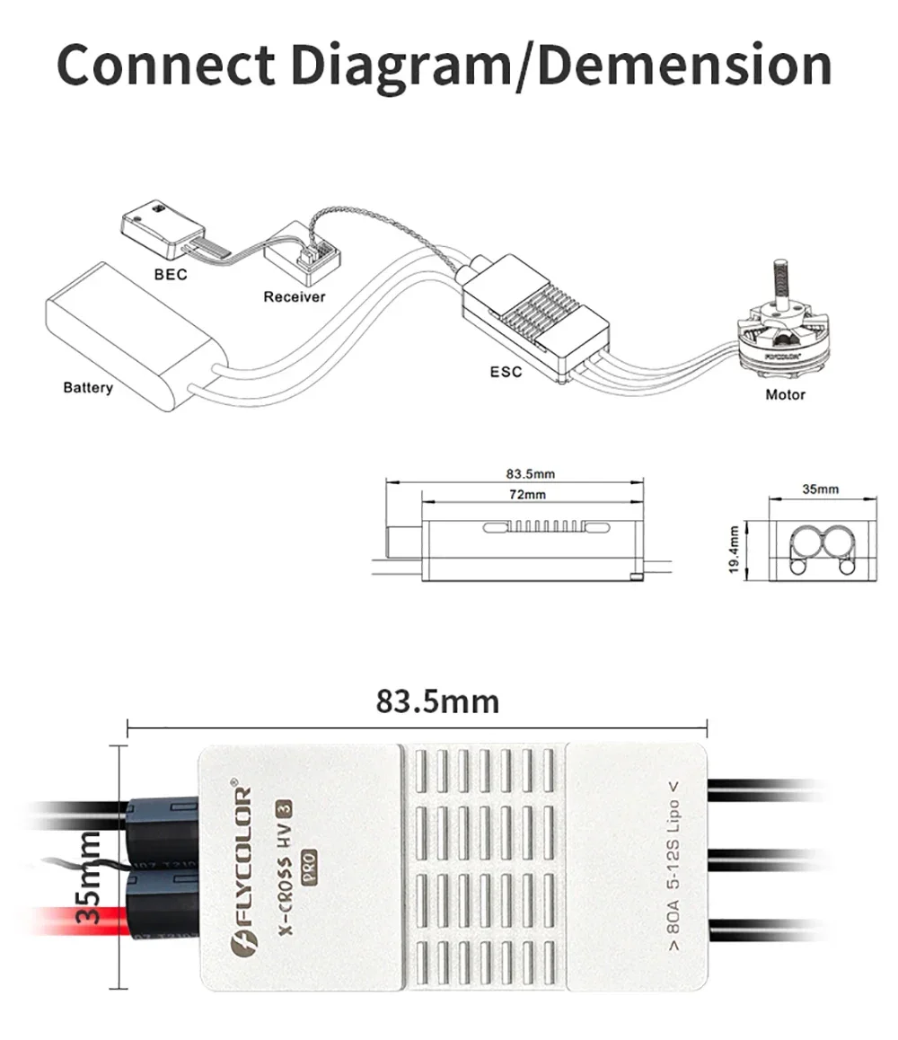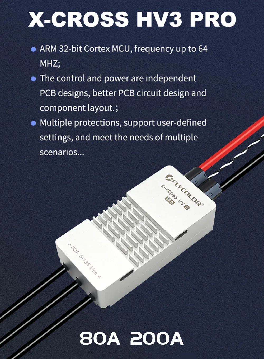 Flycolor 80A/200A ESC Brushless X-CROSS HV3 PRO 5-12S ARM 32-bit No BEC Electric Speed Controller for RC Airplane Drone Model Upgrade Parts Features: 1. High Performance: 80A/200A electric speed controller, with the quality components. It is a wonderful upgrade replacement for broken or old one, and it also can help improve the overall comprehensive performance. 2. Multiple Protections: It can better provide comprehensive protection such as temperature protection,current Protection,low RPM power protect,stall protection,low voltage protection. Safe and reliable to use, meet your needs. 3. Unique Circuit Design: The control and power are independent PCB designs, better PCB circult design and component layout. Special designed for RC plane, can help better control your RC models. 4. Multiple Protocols: Supports regular 1-2ms pulse width input, as well as One-shot125, Oneshot42 and Multshot ; All Dshot and Pro-shot signals are supported 5. Excellent Heat Dissipation: Use aluminum alloy case for better heat dissipation effect, effectively slow down the temperature rise, which makes ESC more durable.