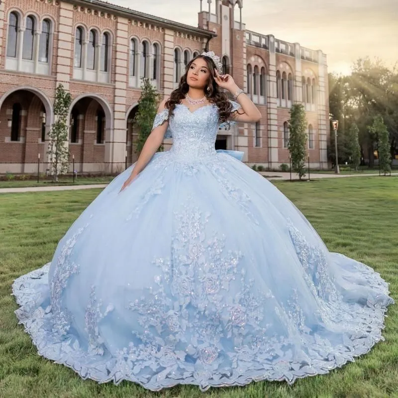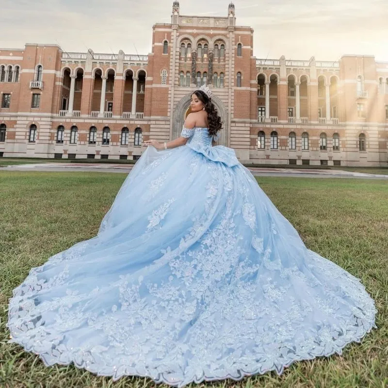 Sky Blue Quinceanera Dress Off Shoulder Lace Flower Applique Ball Gowns Sweet 16