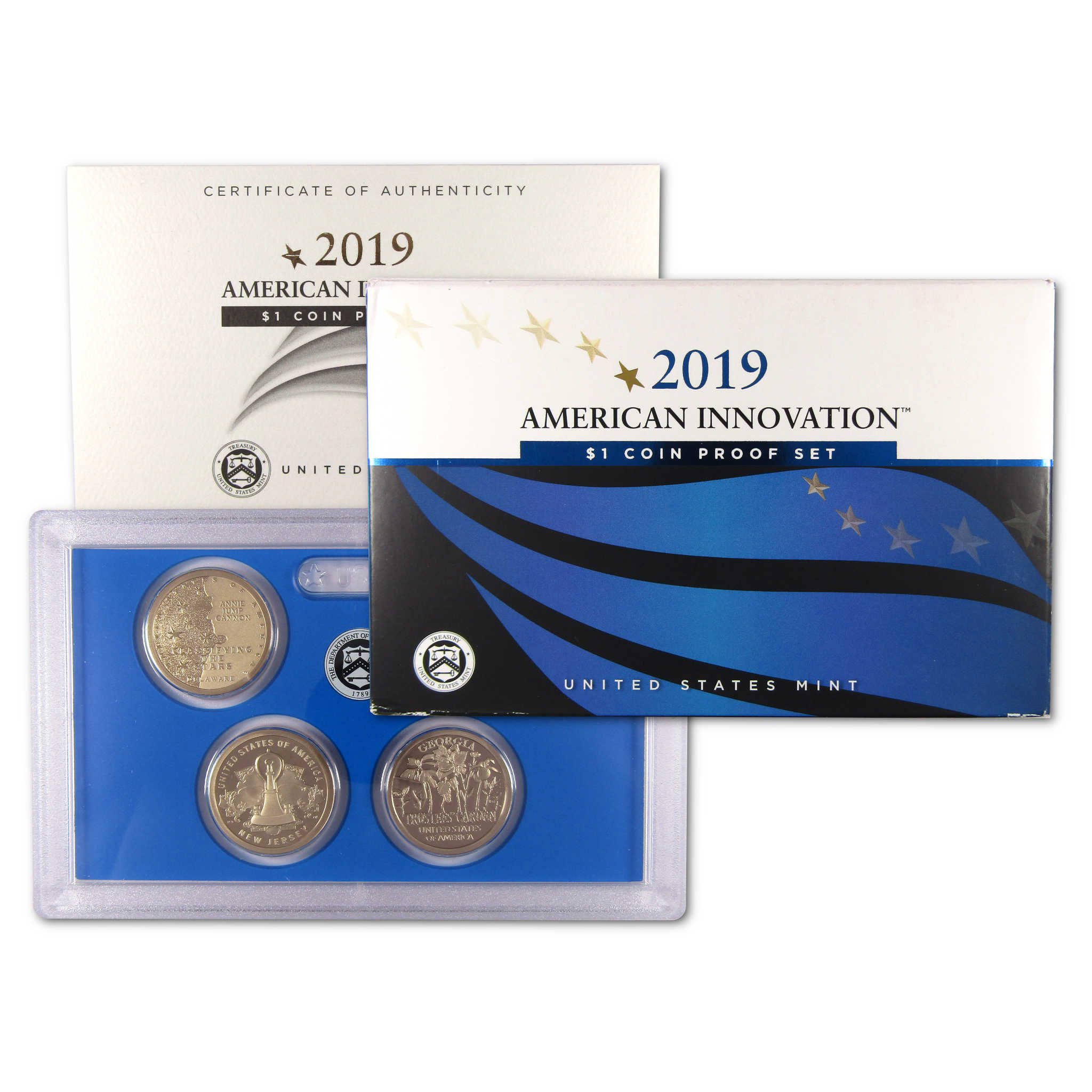 This official 2019 U.S. Mint 4 coin American Innovation Dollar Proof Set contains all four issues, featuring designs honoring Classiying the Stars in Delaware, Polio Vaccine in Pennsylvania, Light Bulb in New Jersey, and Trustees' Garden in Georgia. All coins bear the San Francisco "S" mint mark, and feature extra sharp images and mirror-like surfaces. Comes with the original U.S. Mint packaging, including a certificate of authenticity