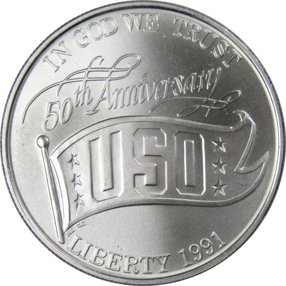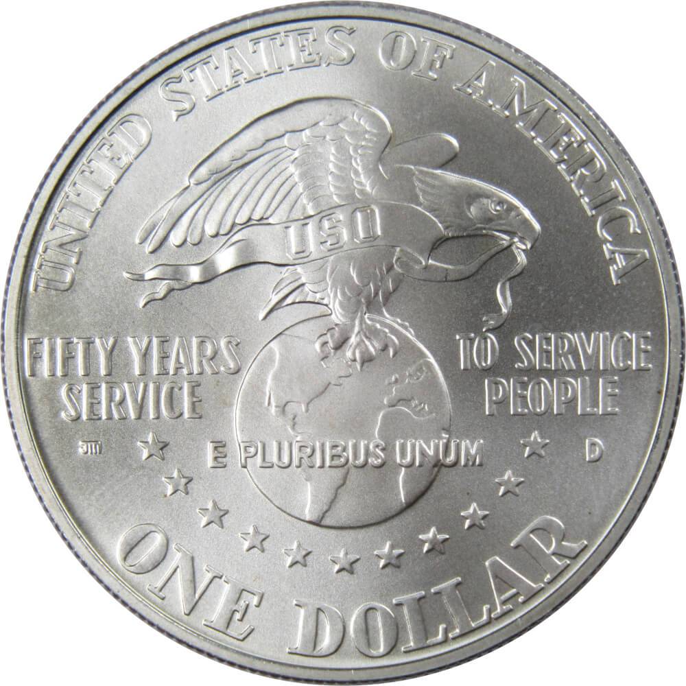 A genuine 1991 D United Service Organizations 50th Anniversary Commemorative Silver Dollar Coin, in Uncirculated Mint State Condition. Contains 90% Silver. Coin only. Does not include any original packaging or a certificate of authenticity