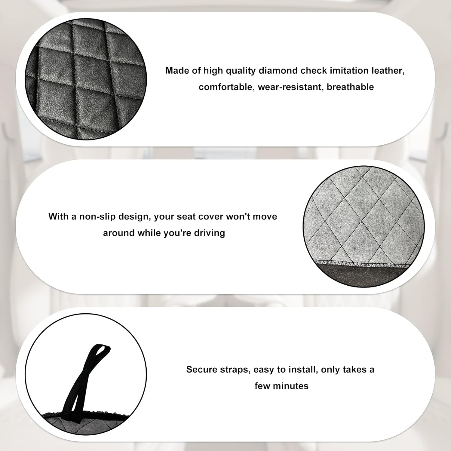 Installing is a matter of minutes. Please contract us, when you need installation instruction. With non-slip design, your seat covers will not move while you are driving.