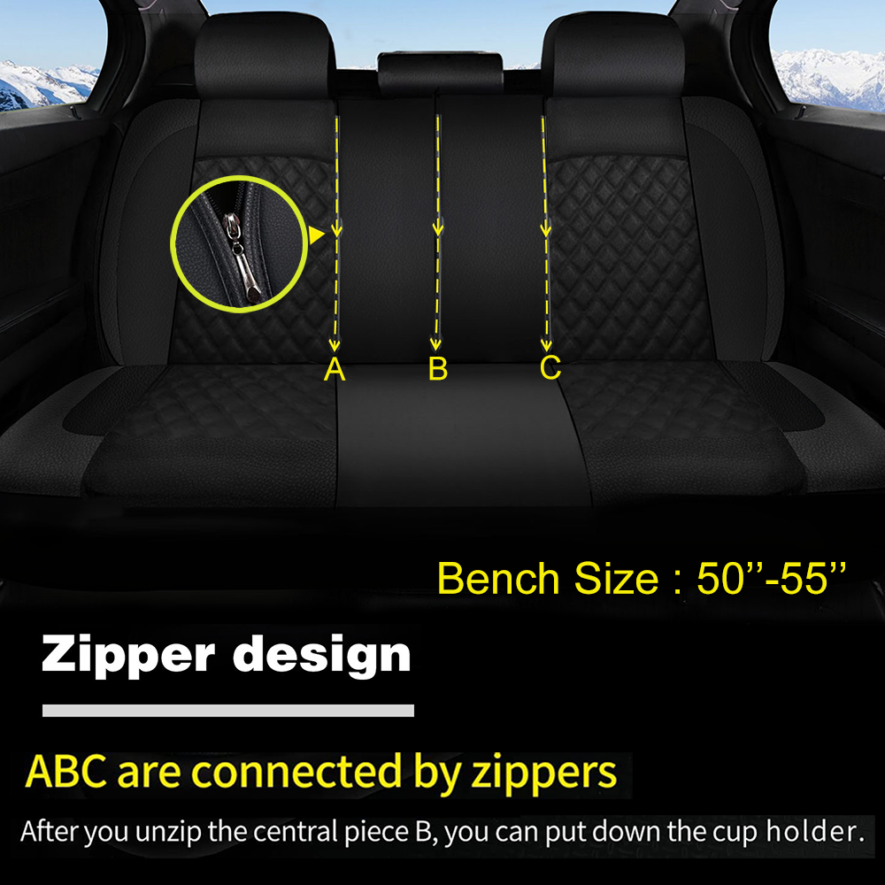 With the line zippers , it can fit vehicles 40/60 spilt,40/20/40 spilt and 50/50 split. It also allows you to fold down the cup holder by pulling down the zipper.