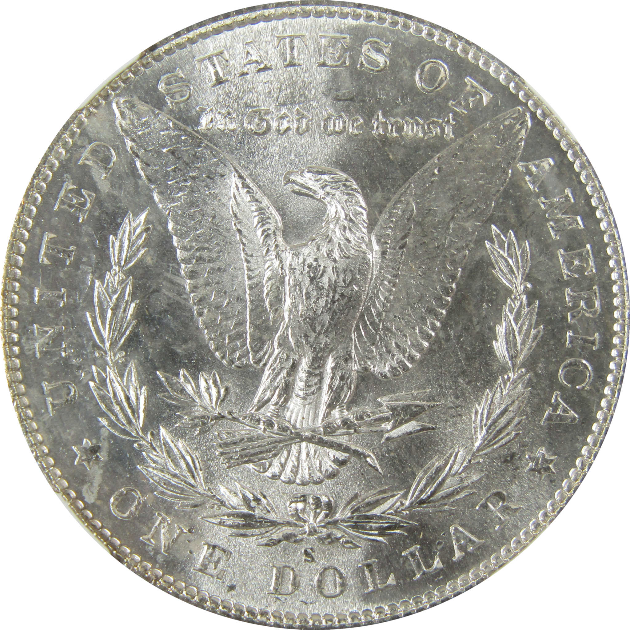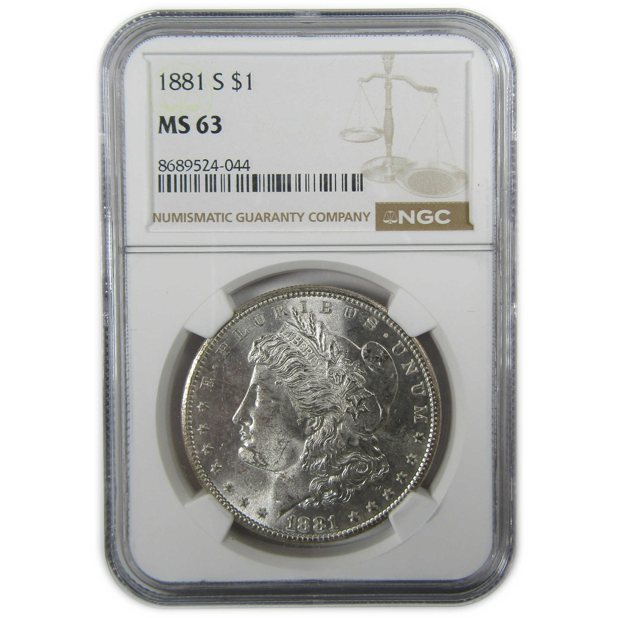 A genuine 1881 S Morgan Silver Dollar Coin, graded and certified MS 63 by NGC. Contains 90% Silver