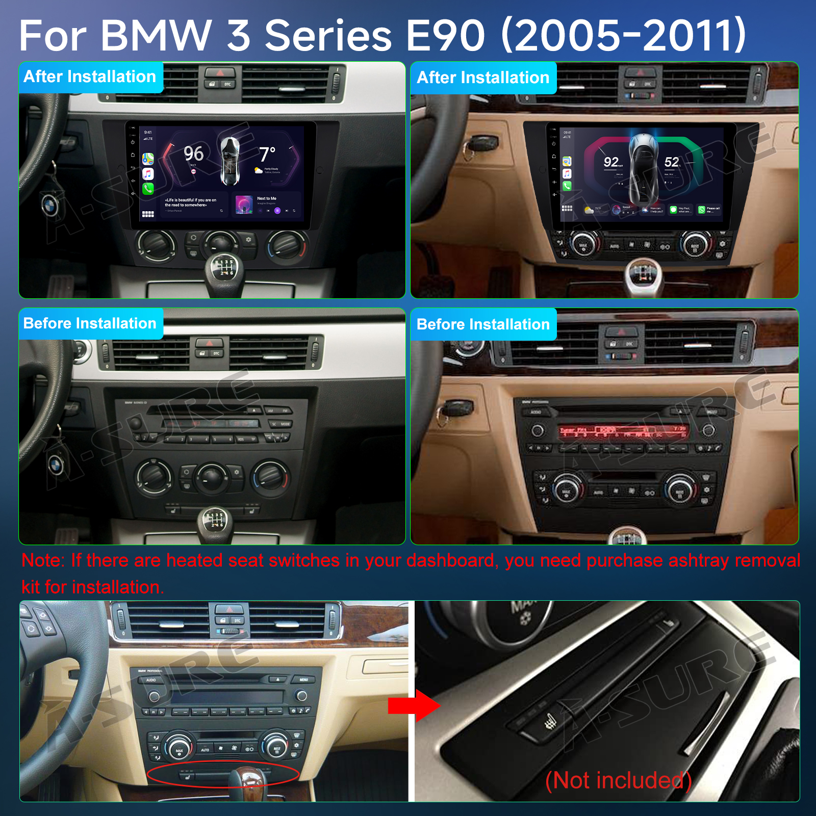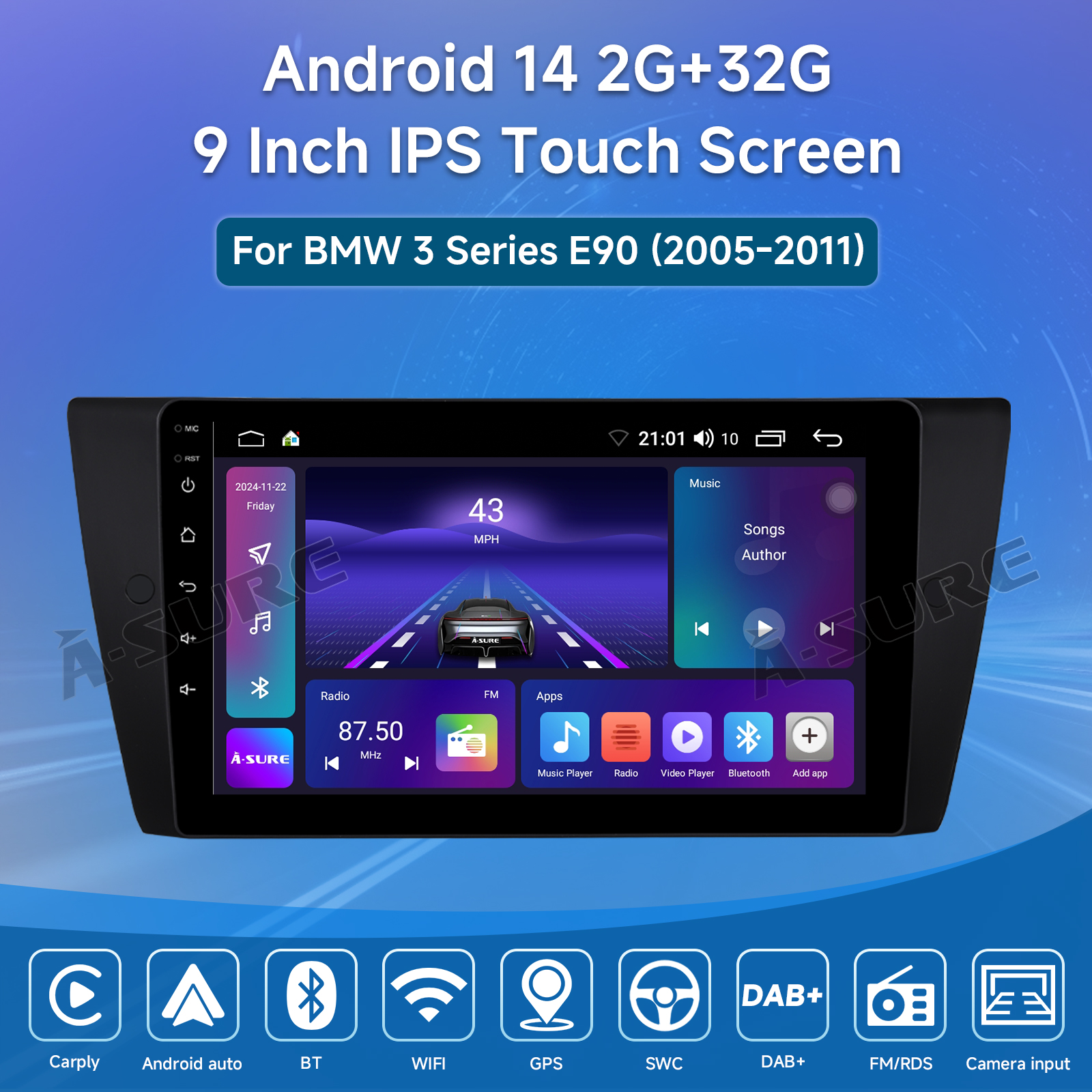 9 Inch Android 14 Car Radio For BMW 3 Series E90 (2005-2011): The Android car radio with 9" 1280 * 720 HD capacitive touchscreen, 2GB RAM and 32GB ROM allows you to download your favorite apps and videos, so driving is no longer boring. No extra frame, no cable change, plug and play.