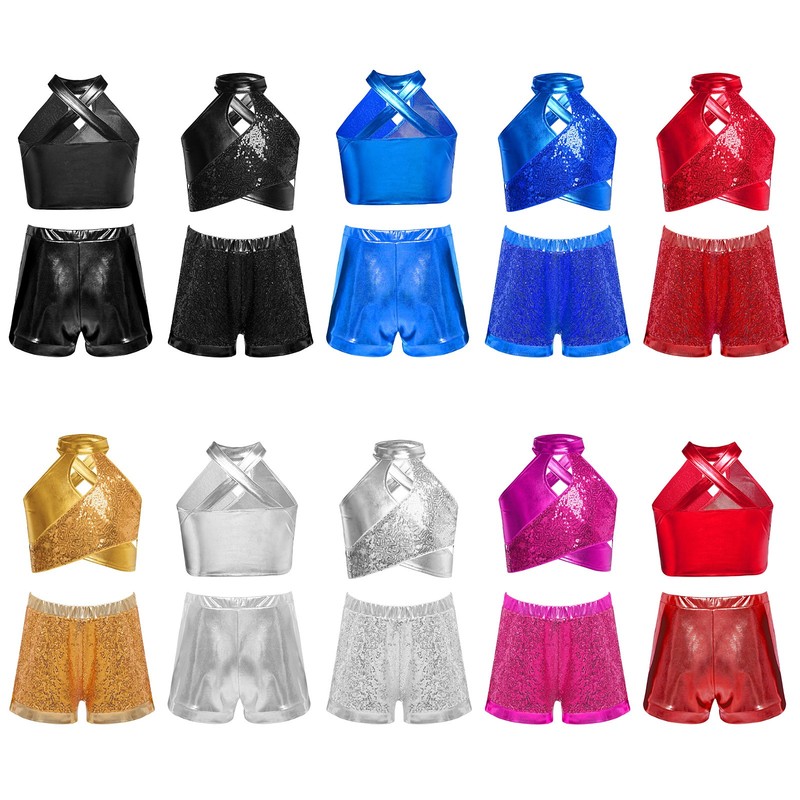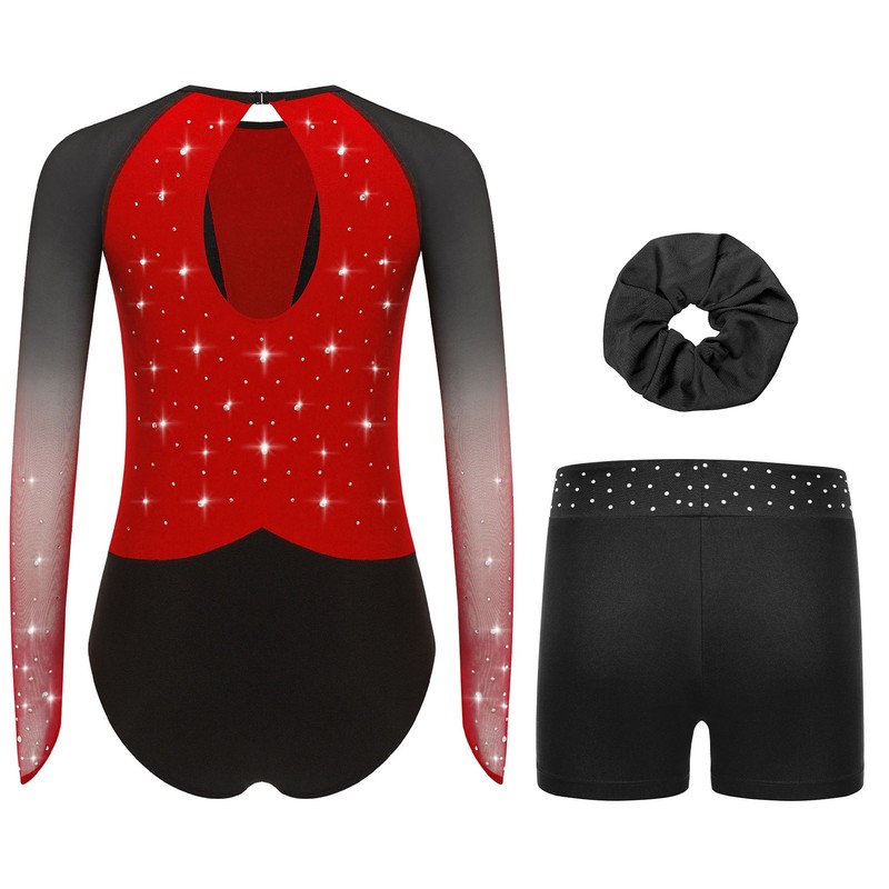 Shiny rhinestones and color-block design on the leotard bring a sense of sparkle and modernity. Come with shorts and a headwear.