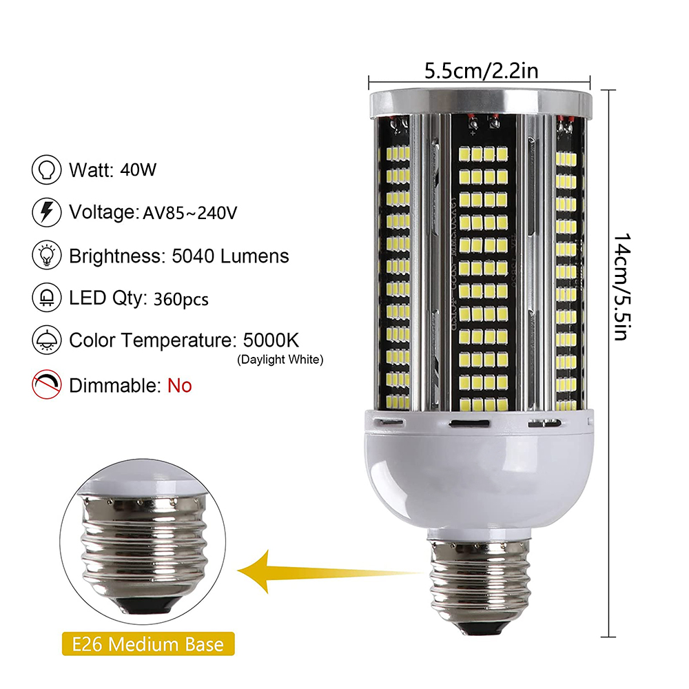 This 40W LED corn light made with a safe premium aluminum alloy housing, stable and durable under maximum performance, over 50,000 hours of constant runtime makes the maintenance cost sharply cut down.