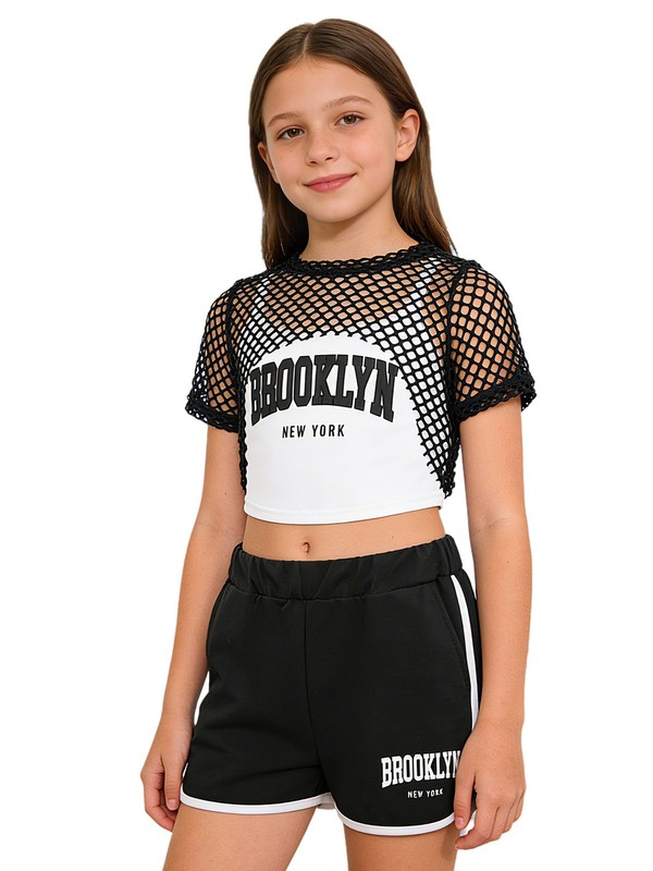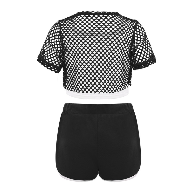 The short-sleeve hollow-out mesh crop top showcases a modern and edgy style, highlighting the wearer’s youthful energy and personality.